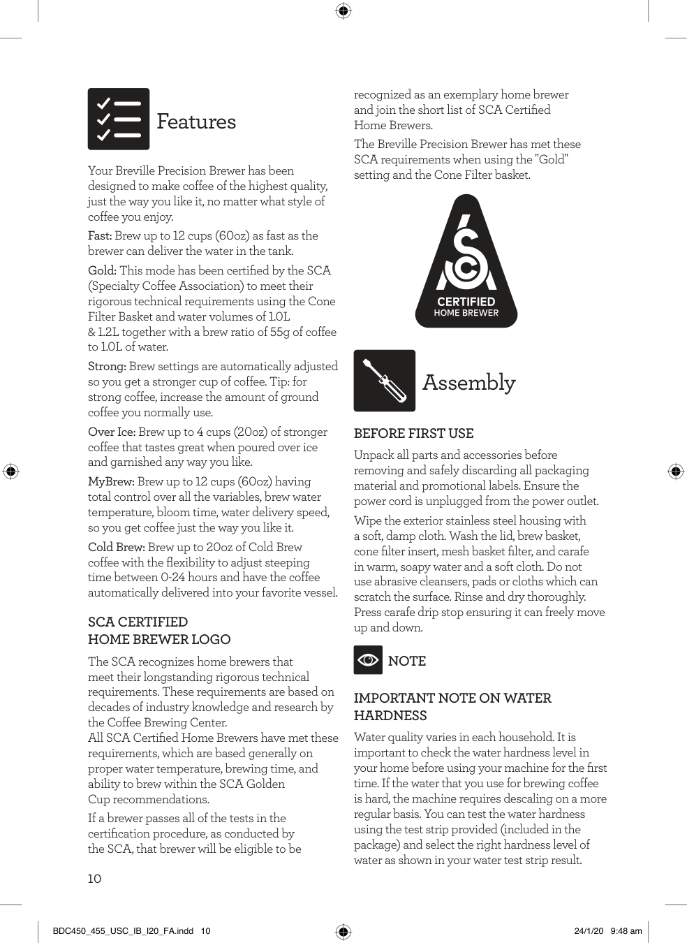 Water quality varies in each household. It is important to check the water hardness level in your home before using your machine for the first time. If the water that you use for brewing coffee is hard, the machine requires descaling on a more regular basis. You can test the water hardness using the test strip provided (included in the package) and select the right hardness level of water as shown in your water test strip result. recognized as an exemplary home brewer and join the short list of SCA Certified Home Brewers. The Breville Precision Brewer has met these SCA requirements when using the "Gold" setting and the Cone Filter basket. BDC450_455_USC_IB_I20_FA.indd 10 24/1/20 9:48 am11 Operation
