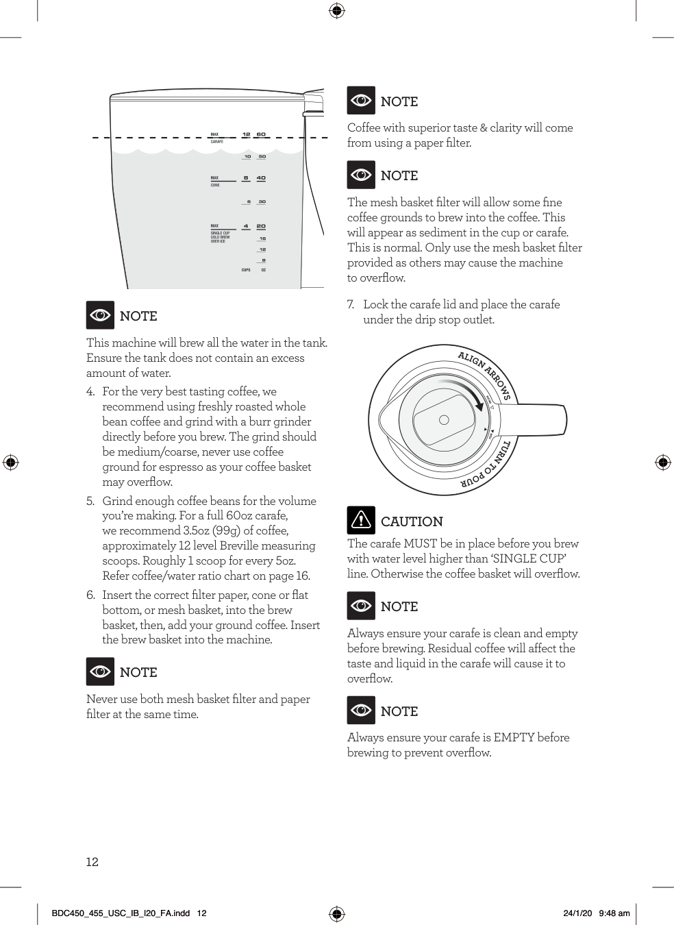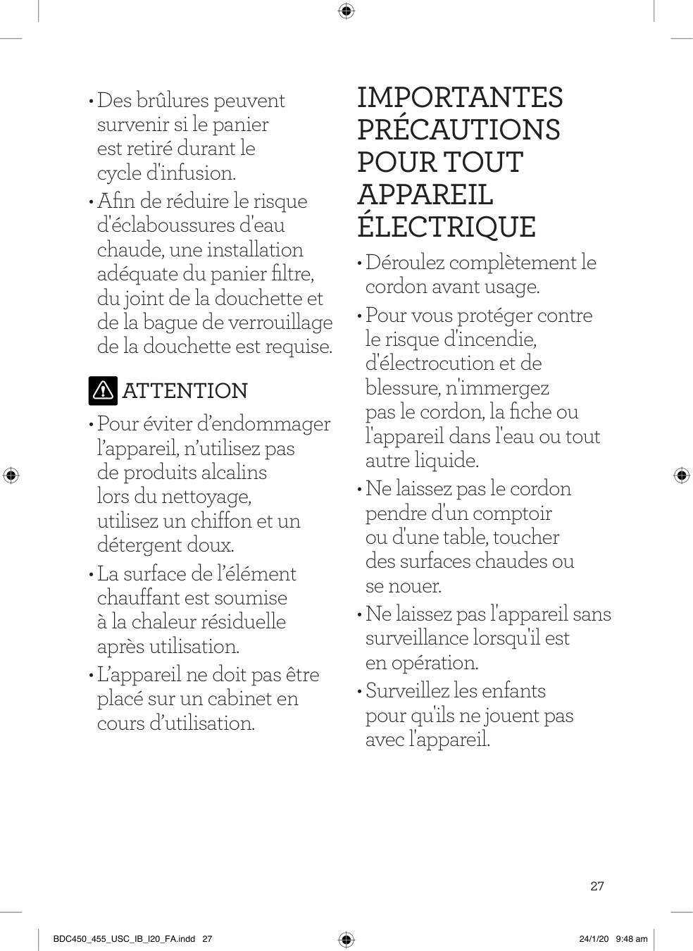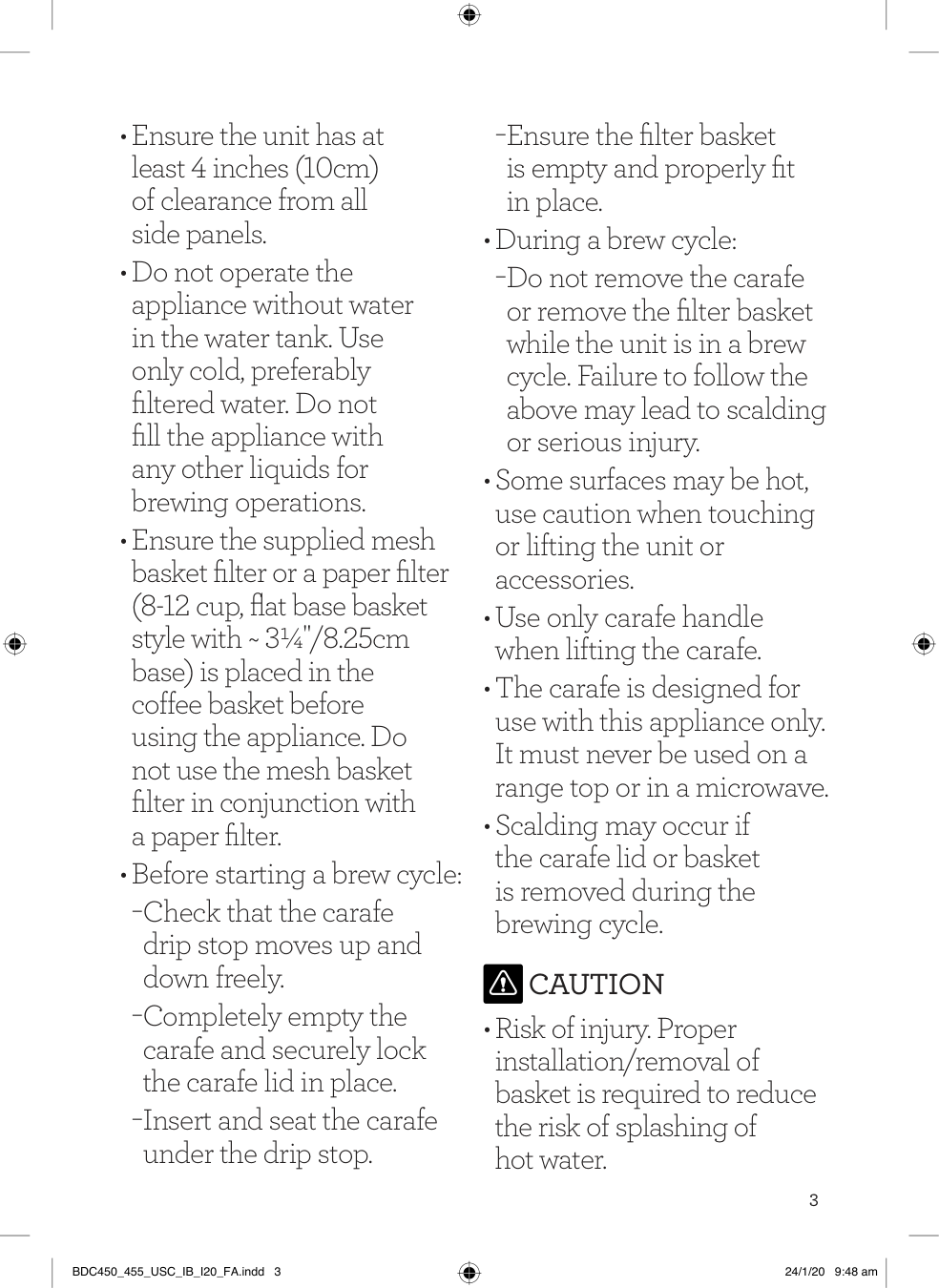 Le fait de remplir le panier sans panier filtre à mailles ou filtre en papier entraînera un débordement du panier durant le cycle d'infusion.BDC450_455_USC_IB_I20_FA.indd 35 24/1/20 9:48 am