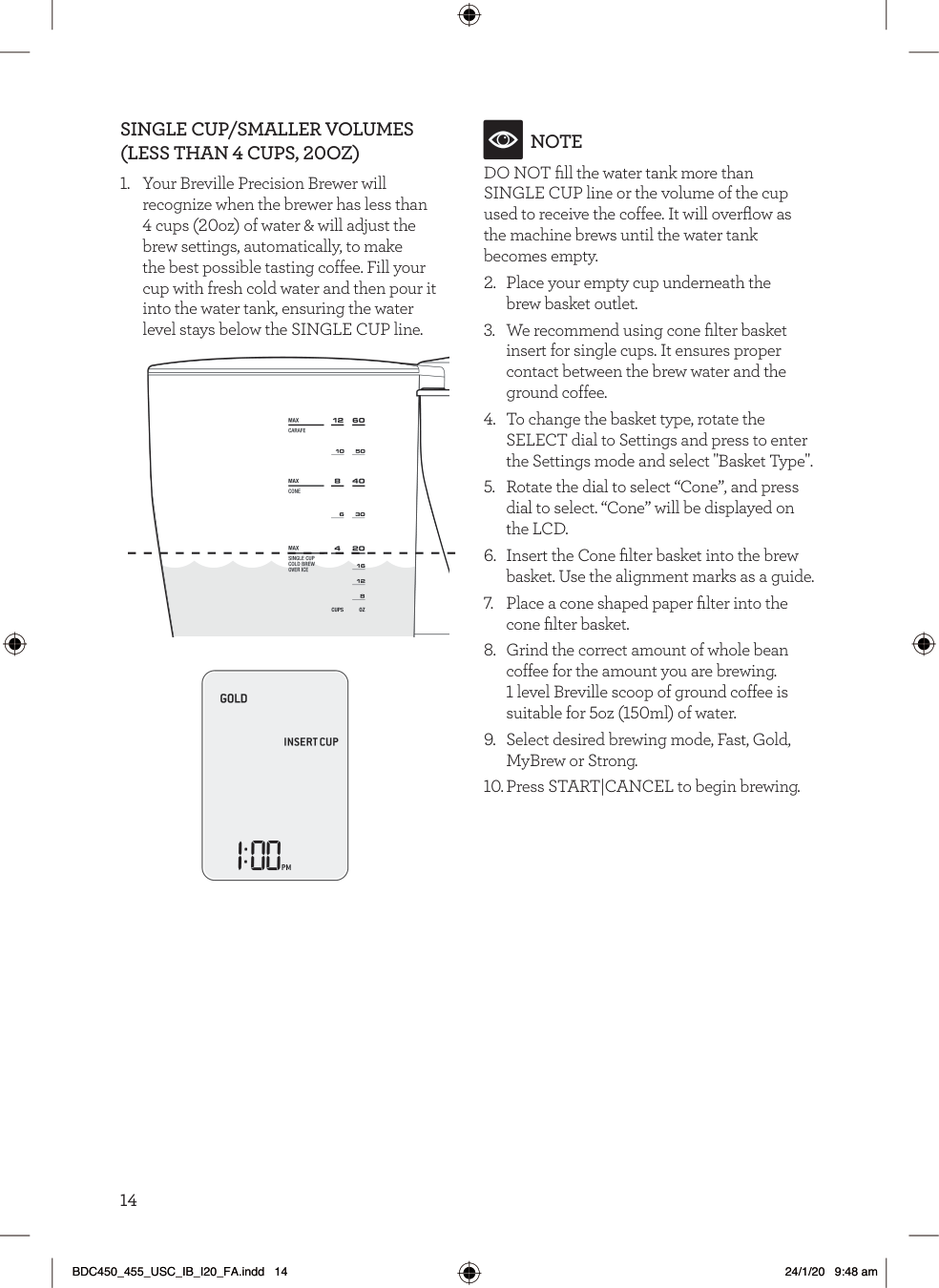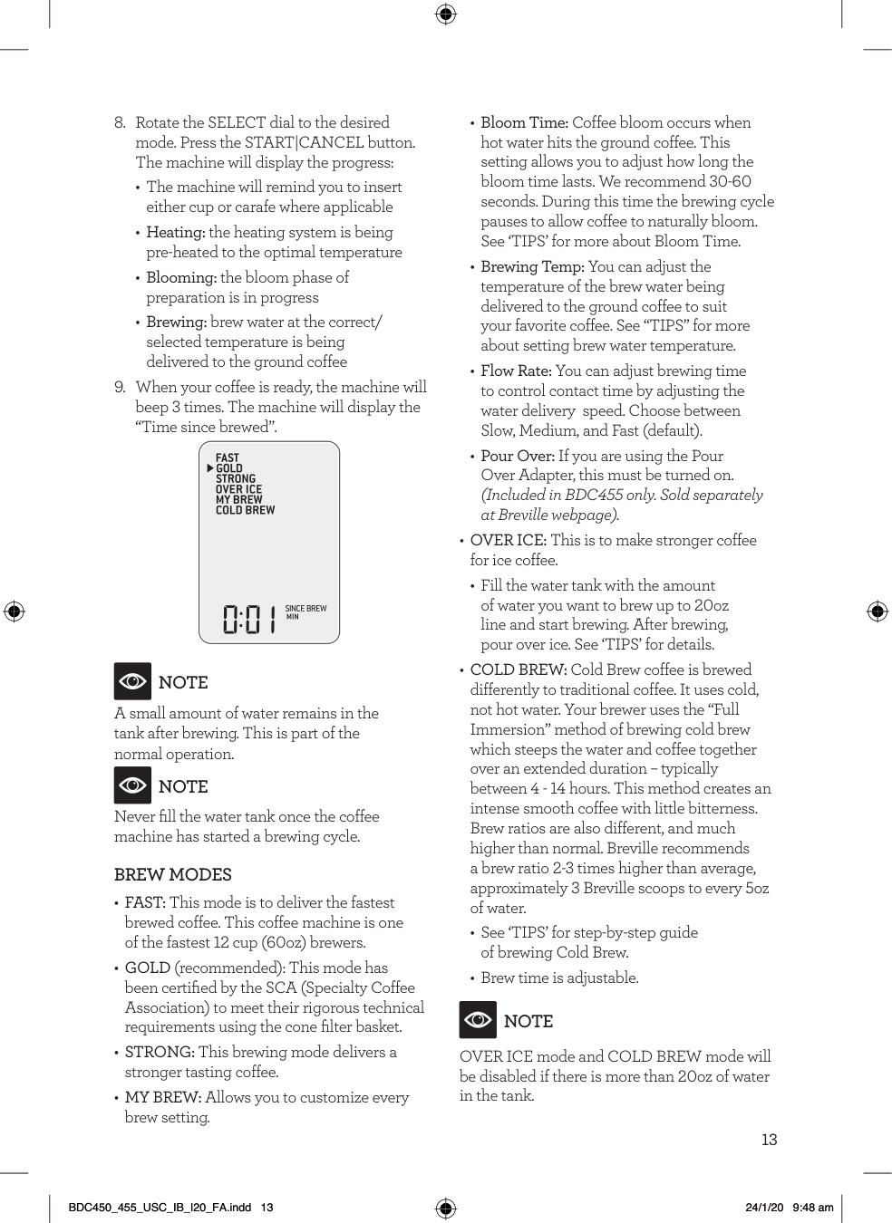 10 Your Breville Precision Brewer has been designed to make coffee of the highest quality, just the way you like it, no matter what style of coffee you enjoy. Fast: Brew up to 12 cups (60oz) as fast as the brewer can deliver the water in the tank. Gold: This mode has been certified by the SCA (Specialty Coffee Association) to meet their rigorous technical requirements using the Cone Filter Basket and water volumes of 1.0L & 1.2L together with a brew ratio of 55g of coffee to 1.0L of water. Strong: Brew settings are automatically adjusted so you get a stronger cup of coffee. Tip: for strong coffee, increase the amount of ground coffee you normally use. Over Ice: Brew up to 4 cups (20oz) of stronger coffee that tastes great when poured over ice and garnished any way you like. MyBrew: Brew up to 12 cups (60oz) having total control over all the variables, brew water temperature, bloom time, water delivery speed, so you get coffee just the way you like it. Cold Brew: Brew up to 20oz of Cold Brew coffee with the flexibility to adjust steeping time between 0-24 hours and have the coffee automatically delivered into your favorite vessel.