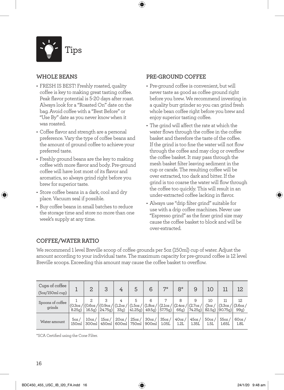 La SCA reconnaît les torréfacteurs domestiques qui répondent à ses exigences techniques rigoureuses solidement implantées. Ces exigences reposent sur des décennies de connaissances et de recherches de l'industrie par le Coffee Brewing Center. Tous les torréfacteurs domestiques certifiés SCA ont satisfait à ces exigences généralement basées sur la température de l'eau, le temps d'infusion et la capacité d'infuser selon les recommandations de la Coupe d'or SCA. Si le torréfacteur réussit tous les tests de certification, tels qu'effectués par la SCA, ce dernier pourra être reconnu comme torréfacteur domestique exemplaire et se joindre à la courte liste des torréfacteurs domestiques certifiés SCA. La cafetière Precision Brewer de Breville a satisfait à ces exigences de la SCA en utilisant le réglage ''Gold'' et le panier filtre en cône. BDC450_455_USC_IB_I20_FA.indd 33 24/1/20 9:48 am34