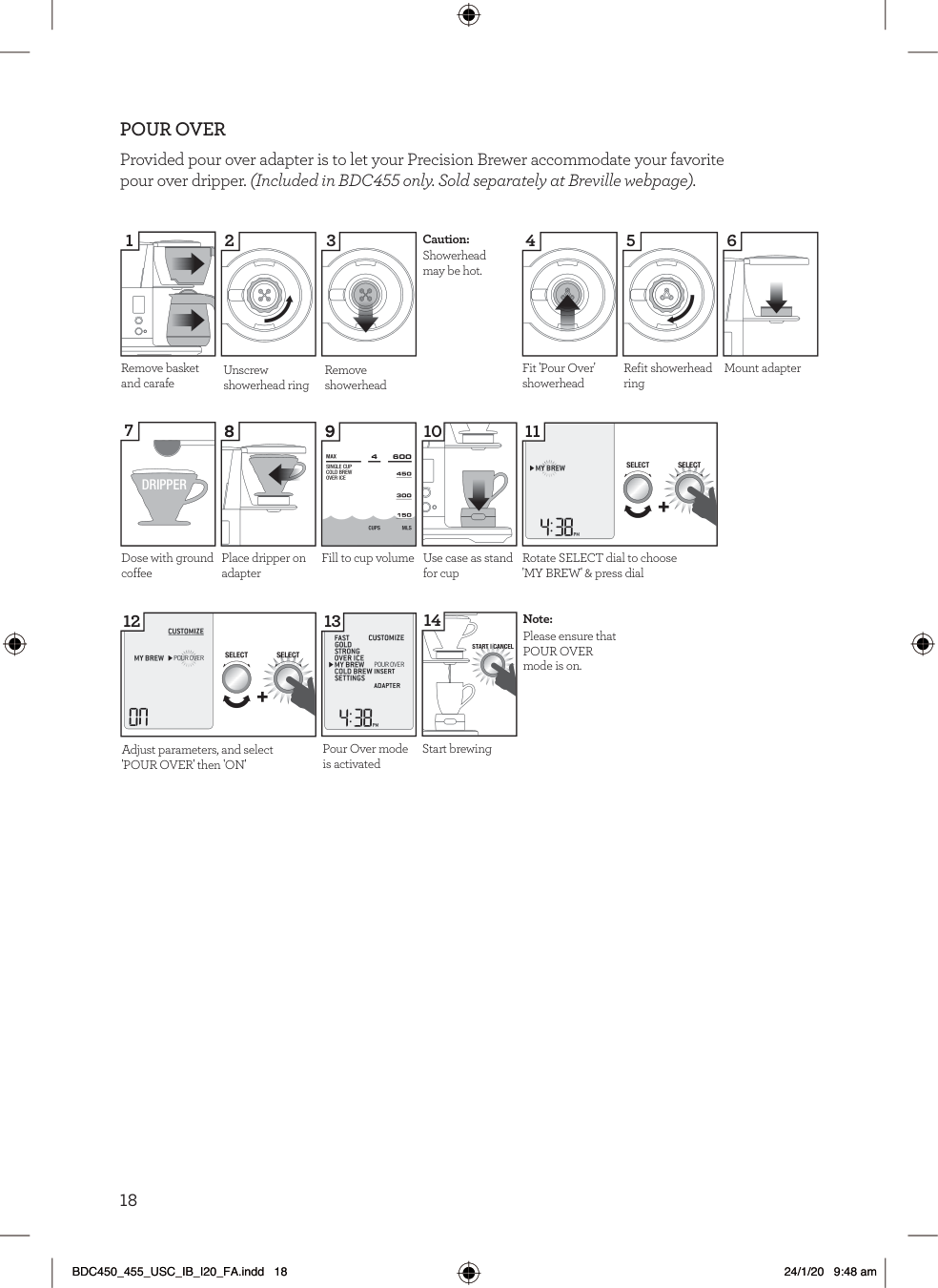 L’adaptateur fourni permet à la Precision Brewer de s’adapter à votre infuseur à café préféré. (Inclus avec la BDC455 seulement. Vendu séparément sur Breville.com.). Fixer la douchette de l'adaptateur/ infuseur Attention: La douchette peut être chaude Note: Vous assurer que le mode 'POUR OVER' est activé Replacer la bague de la douchette Installer l'adaptateur Retirer le panier & la carafe Doser avec du café moulu Régler les paramètres, sélectionner 'POUR OVER' puis 'ON' Remplir jusqu'au volume 1 tasse Placer le panier sur l'adaptateur Déposer la tasse sur le boîtier Tourner le cadran SÉLECTION pour choisir 'MY BREW' et appuyer sur le cadran Débuter l'infusion Le mode'Pour Over'