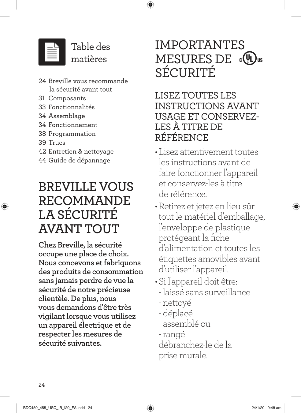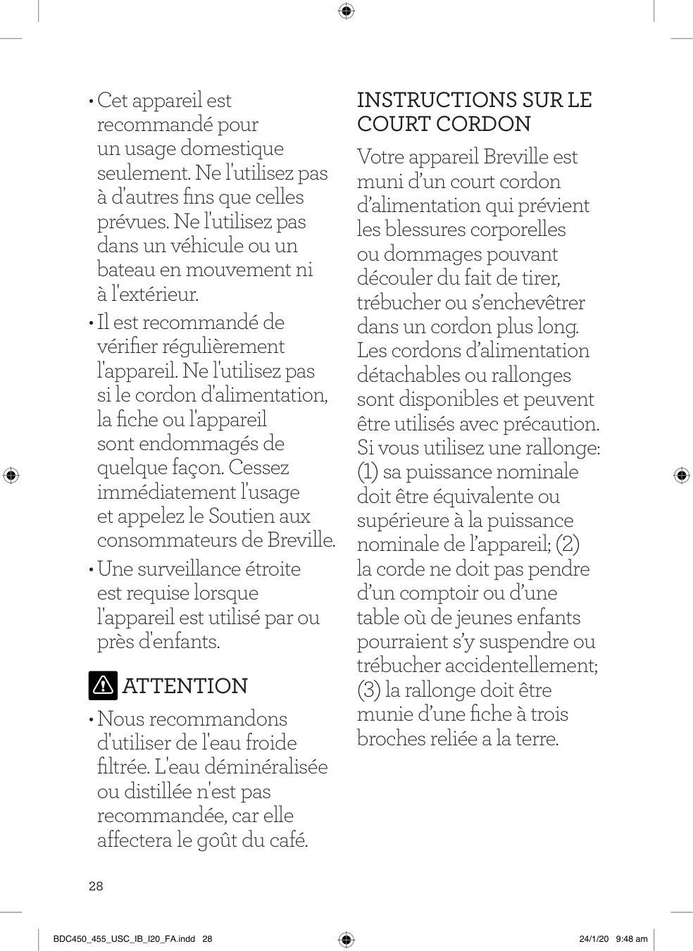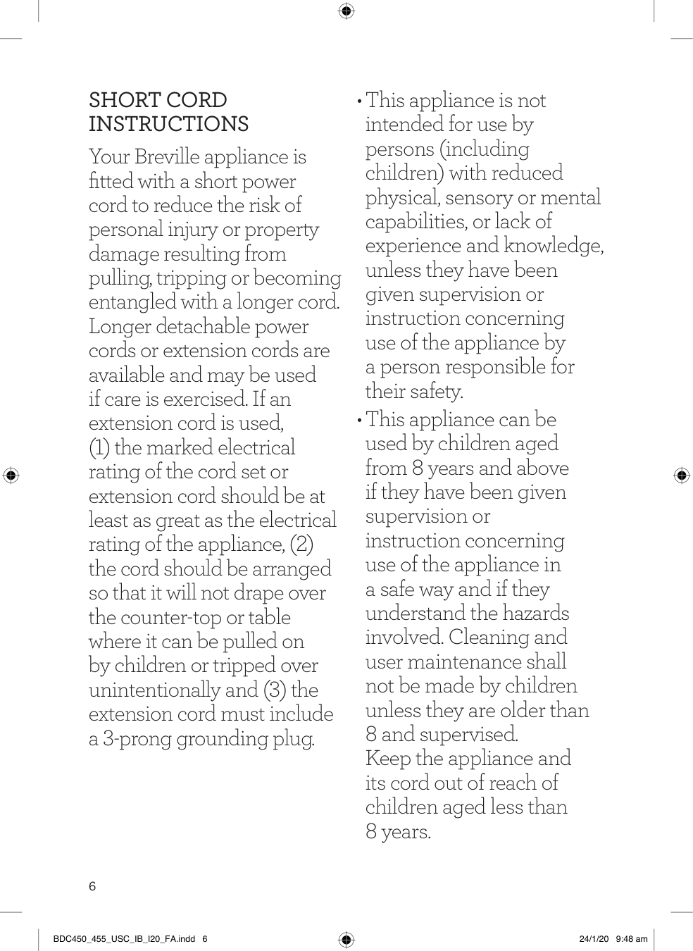 Votre appareil Breville est muni d’un court cordon d’alimentation qui prévient les blessures corporelles ou dommages pouvant découler du fait de tirer, trébucher ou s’enchevêtrer dans un cordon plus long. Les cordons d’alimentation détachables ou rallonges sont disponibles et peuvent être utilisés avec précaution. Si vous utilisez une rallonge: (1) sa puissance nominale doit être équivalente ou supérieure à la puissance nominale de l’appareil; (2) la corde ne doit pas pendre d’un comptoir ou d’une table où de jeunes enfants pourraient s’y suspendre ou trébucher accidentellement; (3) la rallonge doit être munie d’une fiche à trois broches reliée a la terre. BDC450_455_USC_IB_I20_FA.indd 28 24/1/20 9:48 am29
