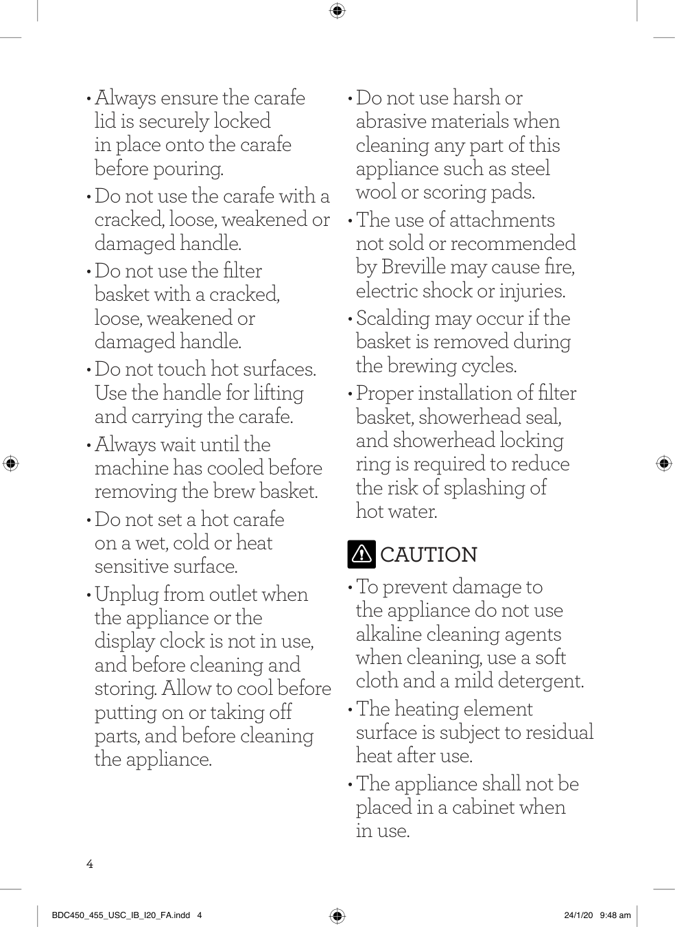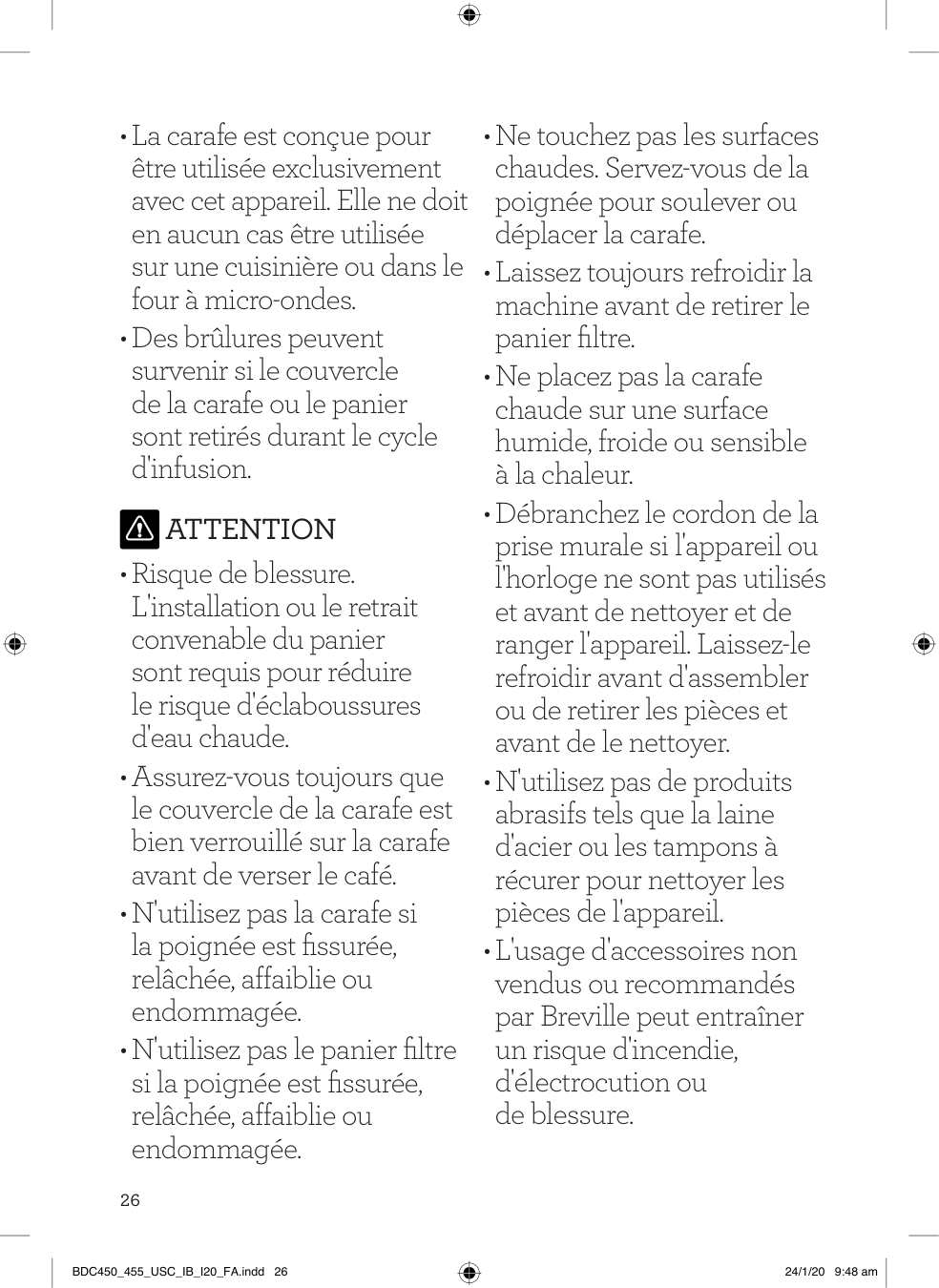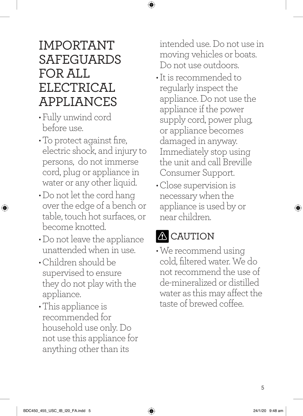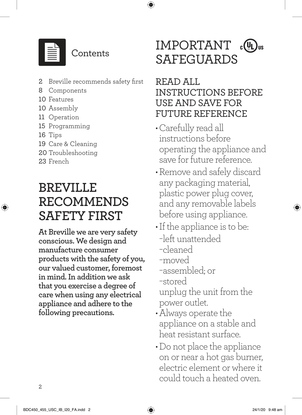 Votre appareil Breville est muni d’un court cordon d’alimentation qui prévient les blessures corporelles ou dommages pouvant découler du fait de tirer, trébucher ou s’enchevêtrer dans un cordon plus long. Les cordons d’alimentation détachables ou rallonges sont disponibles et peuvent être utilisés avec précaution. Si vous utilisez une rallonge: (1) sa puissance nominale doit être équivalente ou supérieure à la puissance nominale de l’appareil; (2) la corde ne doit pas pendre d’un comptoir ou d’une table où de jeunes enfants pourraient s’y suspendre ou trébucher accidentellement; (3) la rallonge doit être munie d’une fiche à trois broches reliée a la terre. BDC450_455_USC_IB_I20_FA.indd 28 24/1/20 9:48 am29