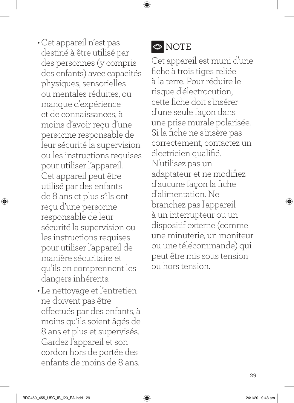 Cet appareil est muni d'une fiche à trois tiges reliée à la terre. Pour réduire le risque d'électrocution, cette fiche doit s'insérer d'une seule façon dans une prise murale polarisée. Si la fiche ne s'insère pas correctement, contactez un électricien qualifié. N'utilisez pas un adaptateur et ne modifiez d'aucune façon la fiche d'alimentation. Ne branchez pas l'appareil à un interrupteur ou un dispositif externe (comme une minuterie, un moniteur ou une télécommande) qui peut être mis sous tension ou hors tension. BDC450_455_USC_IB_I20_FA.indd 29 24/1/20 9:48 am30