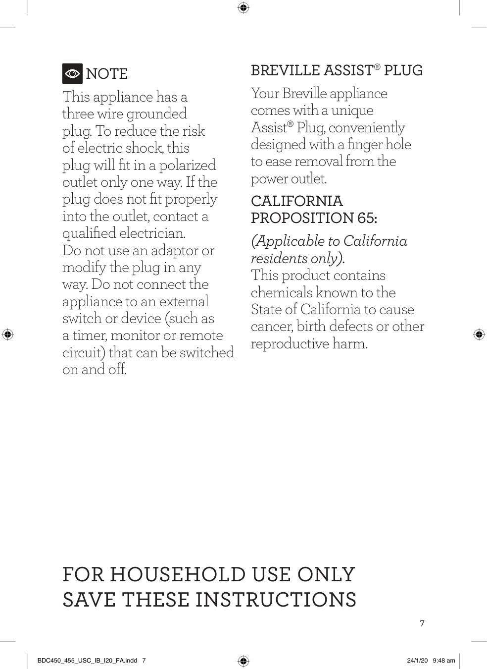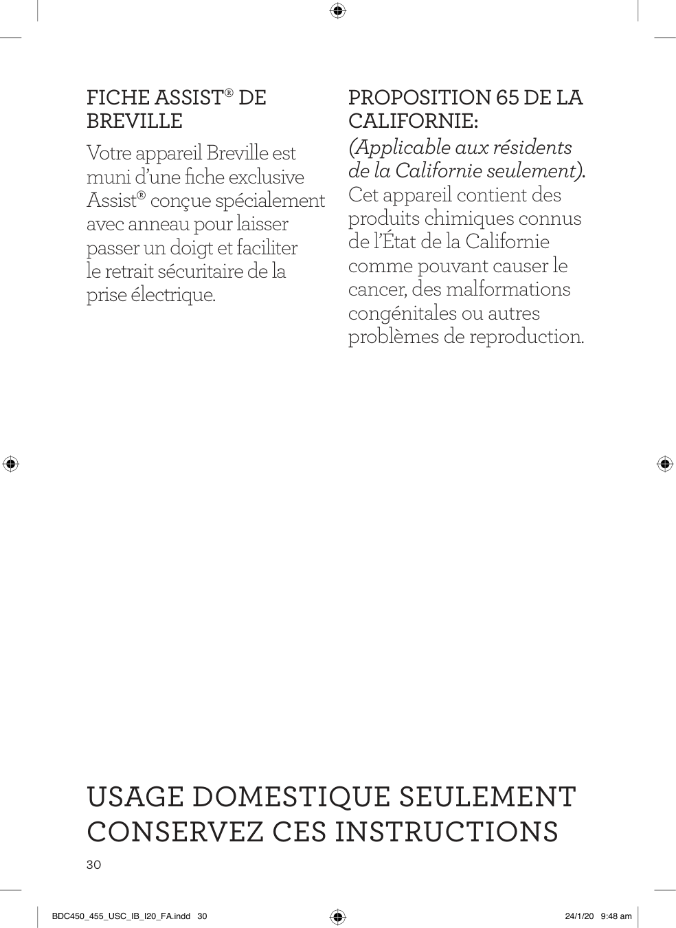 Votre appareil Breville est muni d’une fiche exclusive Assist® conçue spécialement avec anneau pour laisser passer un doigt et faciliter le retrait sécuritaire de la prise électrique.Proposition 65 De La