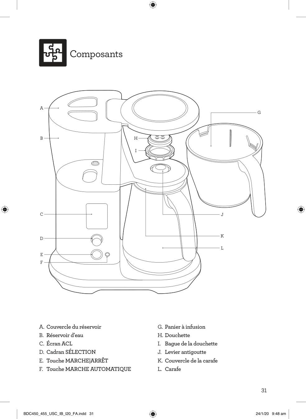 (Applicable aux résidents de la Californie seulement). Cet appareil contient des produits chimiques connus de l’État de la Californie comme pouvant causer le cancer, des malformations congénitales ou autres problèmes de reproduction. BDC450_455_USC_IB_I20_FA.indd 30 24/1/20 9:48 am31 Composants A. Couvercle du réservoir B. Réservoir d'eau C. Écran ACL D. Cadran SÉLECTION E. Touche MARCHE|ARRÊT F. Touche MARCHE AUTOMATIQUE G. Panier à infusion H. Douchette I. Bague de la douchette J. Levier antigoutte K. Couvercle de la carafe L. Carafe
