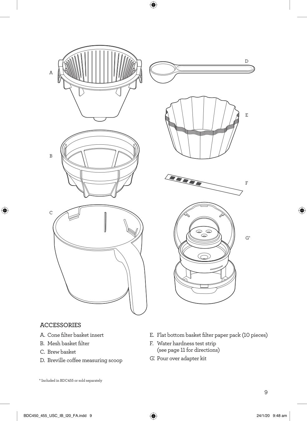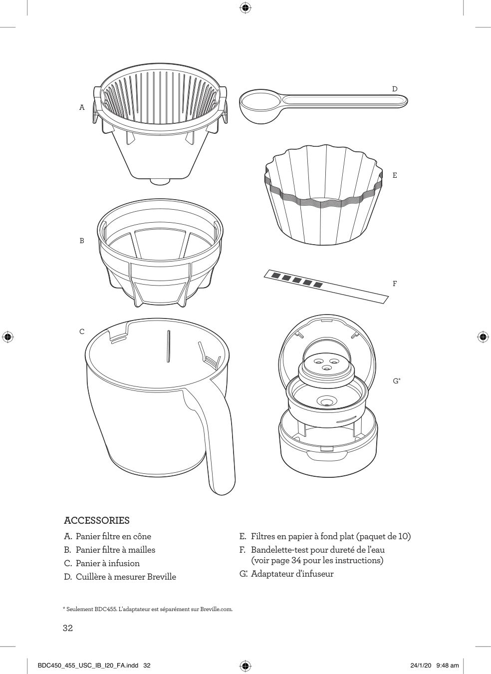 BDC450_455_USC_IB_I20_FA.indd 31 24/1/20 9:48 am32 A. Panier filtre en cône B. Panier filtre à mailles C. Panier à infusion D. Cuillère à mesurer Breville E. Filtres en papier à fond plat (paquet de 10) F. Bandelette-test pour dureté de l'eau (voir page 34 pour les instructions) G. Adaptateur d'infuseur