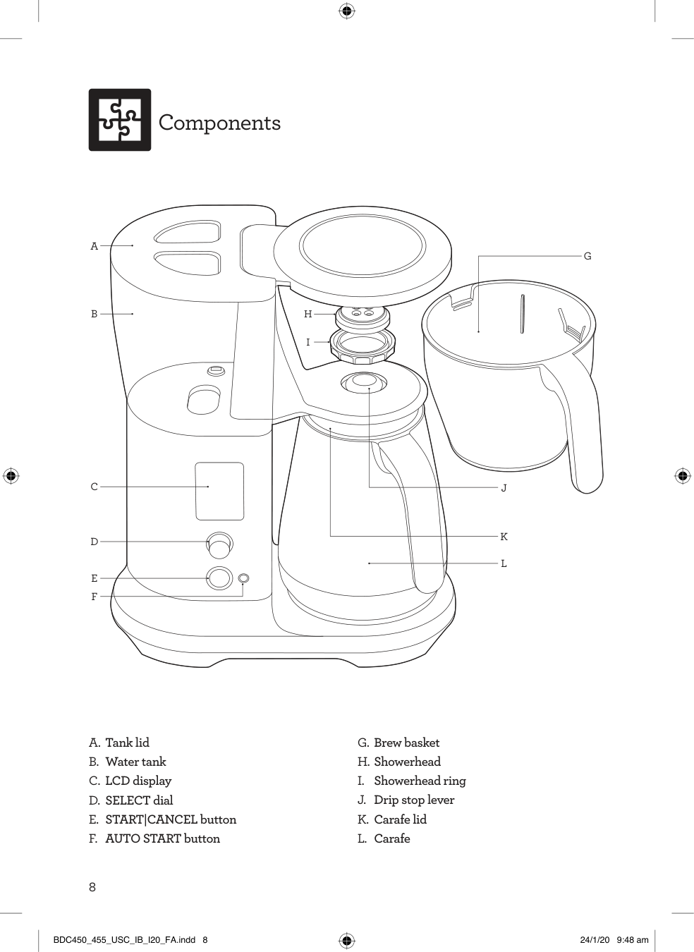 (Applicable to California residents only). This product contains chemicals known to the State of California to cause cancer, birth defects or other reproductive harm. BDC450_455_USC_IB_I20_FA.indd 7 24/1/20 9:48 am8 A. Tank lid B. Water tank C. LCD display D. SELECT dial E. START|CANCEL button F. AUTO START button G. Brew basket H. Showerhead I. Showerhead ring J. Drip stop lever K. Carafe lid L. Carafe Components