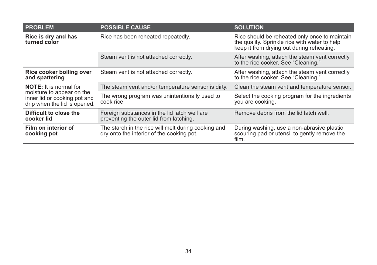 La olla arrocera no funciona El cable de alimentación no está completamente enchufado a una toma de corriente de 3 clavijas que funcione. Conecte el cable de alimentación a la toma de corriente. Ha habido una falla de energía. Reinicie el disyuntor o reemplace el fusible una YH]TXHVHUHVWDEOH]FDODHQHUJtD Se conectó otro electrodoméstico a la misma toma de corriente, que disparó el disyuntor o fundió un fusible doméstico. Reinicie el disyuntor o reemplace el fusible. Enchufe el cable de alimentación en un circuito VHSDUDGR\HVSHFt¿FR34