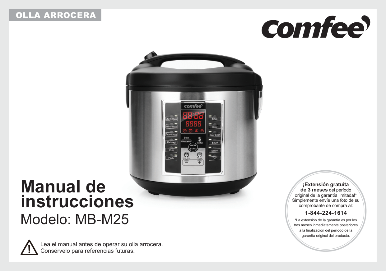 Instruction Manual Model: MB-M25 Please read the manual before operating your rice cooker. Retain it for future reference. Free 3 months extension of the original limited warranty period!* Simply text a picture of your proof of purchase to: 1-844-224-1614 *The warranty extension is for the three months immediately following the completion of the product’s original warranty period.2