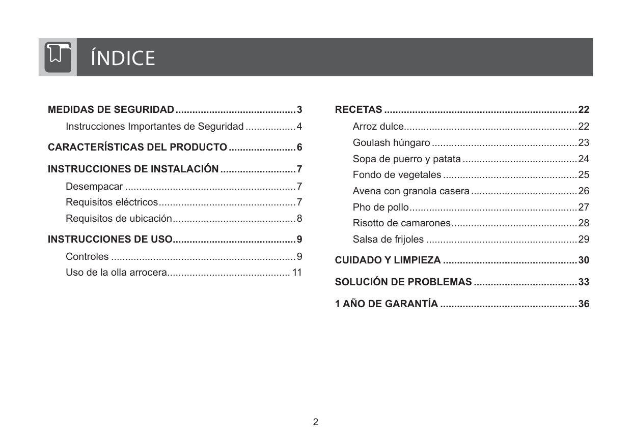 Controls ....................................................................9 Using the Rice Cooker ............................................ 11 RECIPES ......................................................................21 Sweet Rice..............................................................21 Hungarian Goulash .................................................22 Potato and Leek Soup ............................................23 Vegetable Stock ......................................................24 Oatmeal with Homemade Granola .........................25 Chicken Pho ...........................................................26 Shrimp Risotto ........................................................27 Bean Dip .................................................................28Care And Cleaning ...............................................29