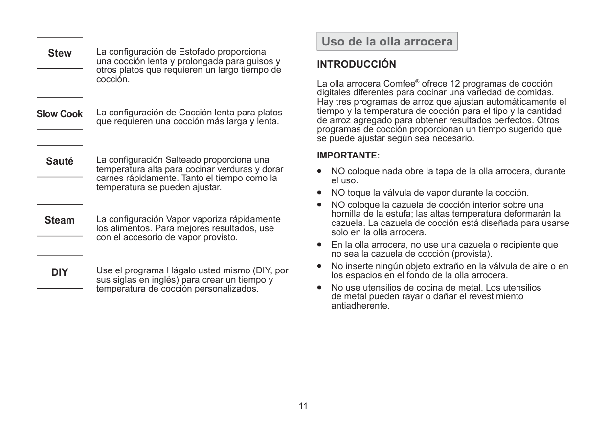 The Comfee® Rice Cooker provides 12 different digital cooking programs to cook a variety of meals. There are three rice programs that automatically adjust the time and cooking temperature for the type and amount of rice added for perfect results. Other cooking programs provide a suggested time that can be adjusted as needed.Important: