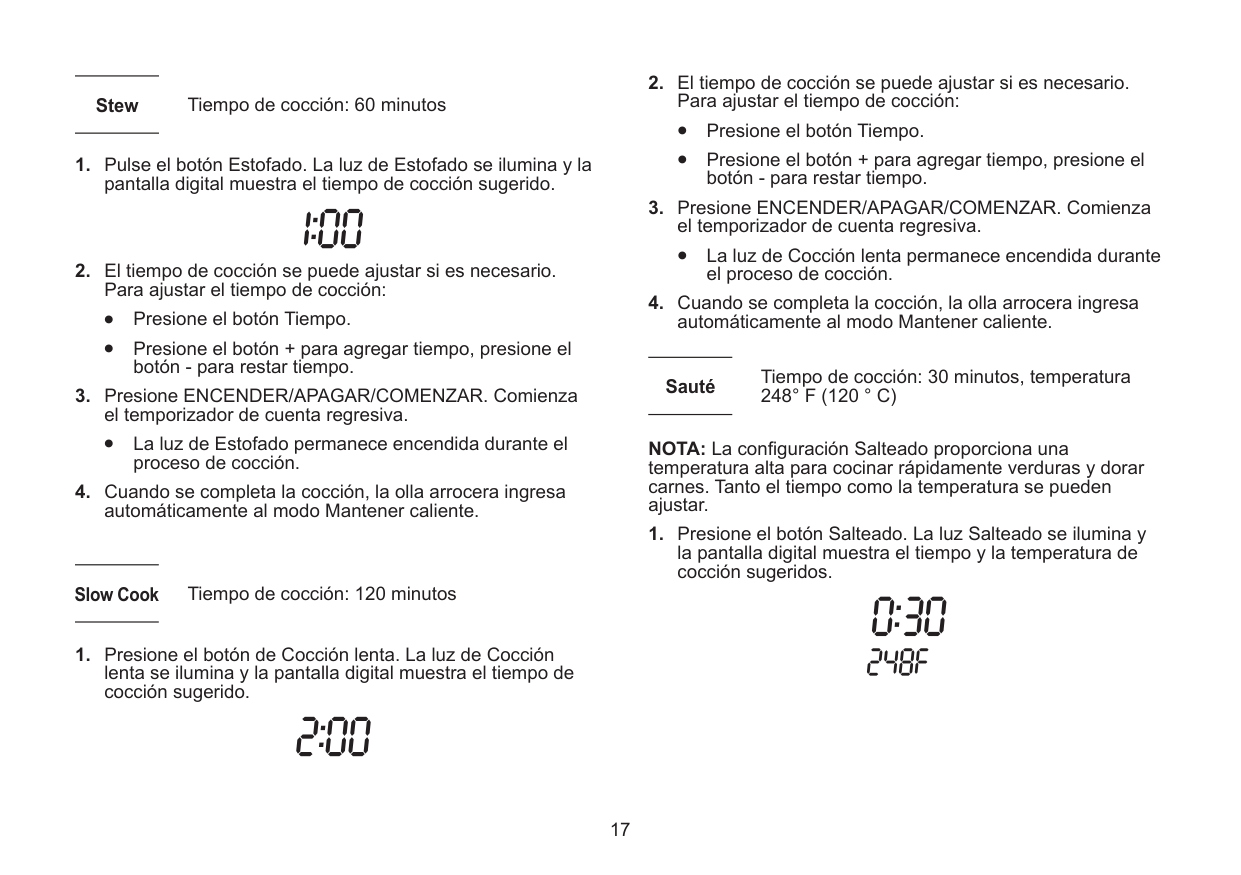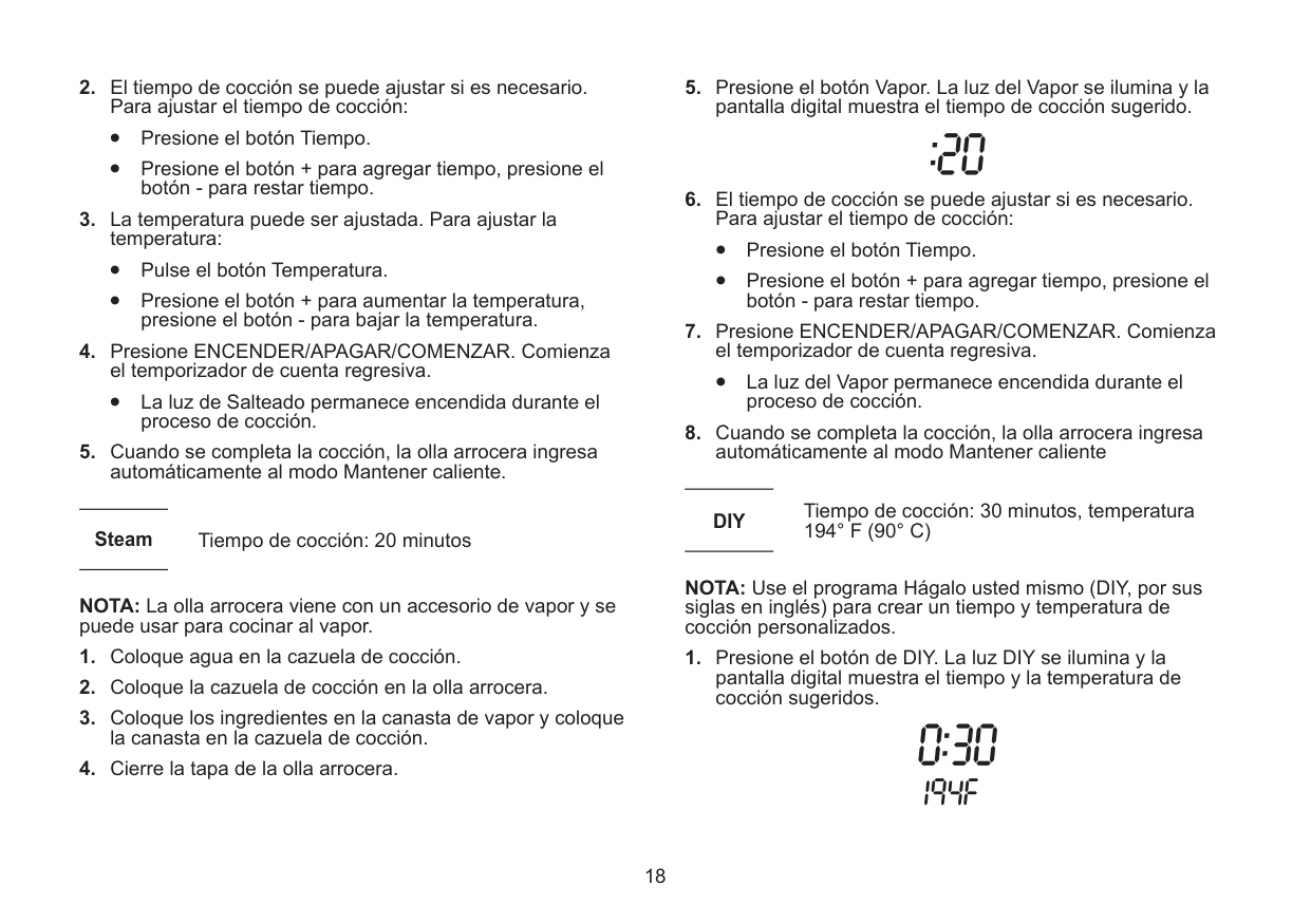 Press the ON/OFF/START button to turn the cooker on or off and to start the cooking process. Delay Timer Press the Delay Timer button to delay the start of the cooking process for up to 24 hours. Use the + and - buttons to adjust the length of time. Decrease Time or Temp Use the - button to subtract time or to raise or lower the temperature. Increase Time or Temp Use the + button to add time or to raise the temperature. Temp Press the Temp button to adjust the temperature. Use the + and - buttons to raise or lower the temperature. Time Press the Time button to adjust the cooking times. Use the + and - buttons to add or subtract time.10 Digital Display