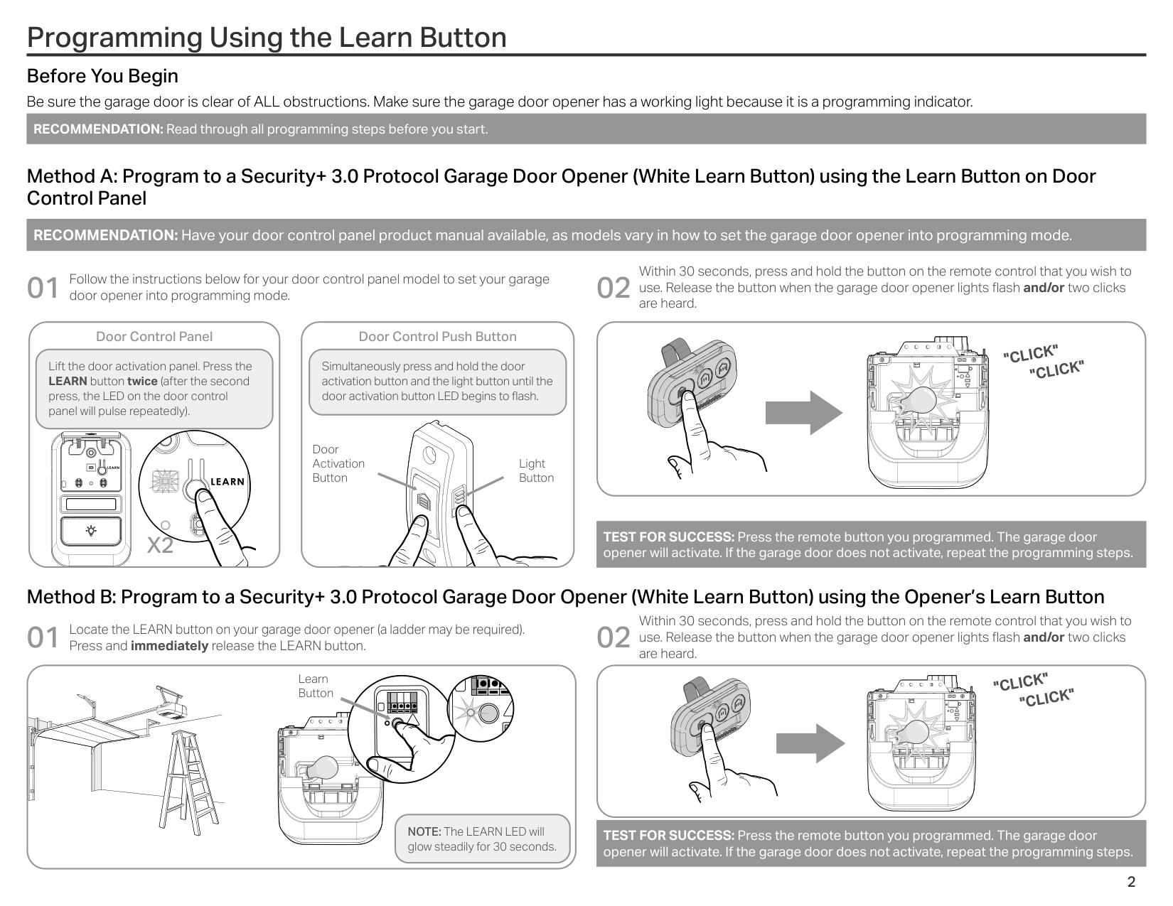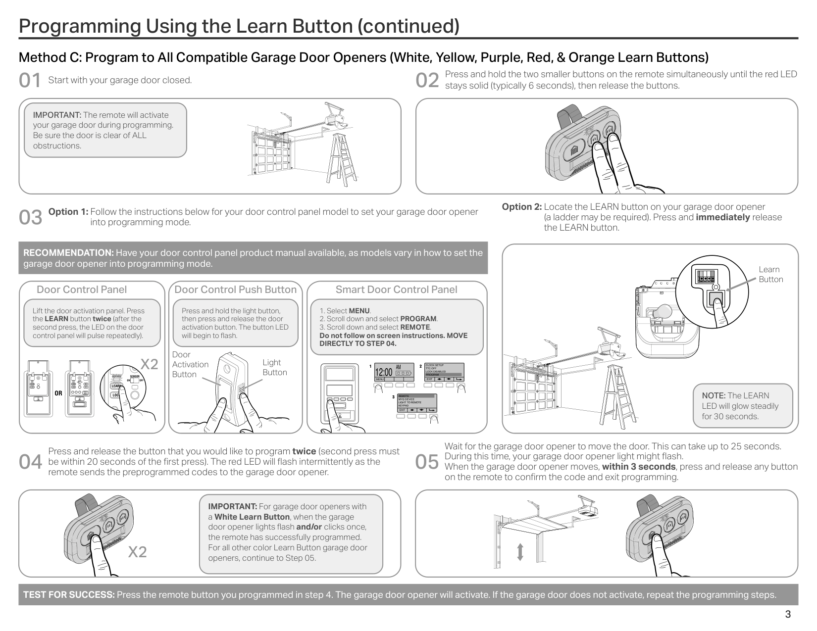TEST FOR SUCCESS: Press the remote button you programmed. The garage door opener will activate. If the garage door does not activate, repeat the programming steps.3 Programming Using the Learn Button (continued) Method C: Program to All Compatible Garage Door Openers (White, Yellow, Purple, Red, & Orange Learn Buttons) 01 Start with your garage door closed. 02 Press and hold the two smaller buttons on the remote simultaneously until the red LED stays solid (typically 6 seconds), then release the buttons. IMPORTANT: The remote will activate your garage door during programming. Be sure the door is clear of ALL obstructions. 03 Option 1: Follow the instructions below for your door control panel model to set your garage door opener into programming mode. Option 2: Locate the LEARN button on your garage door opener (a ladder may be required). Press and immediately release the LEARN button. RECOMMENDATION: Have your door control panel product manual available, as models vary in how to set the garage door opener into programming mode. Learn Button NOTE: The LEARN LED will glow steadily for 30 seconds.