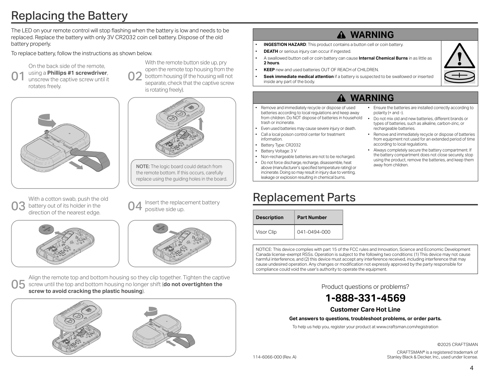 IMPORTANT: For garage door openers with a White Learn Button, when the garage door opener lights flash and/or clicks once, the remote has successfully programmed. For all other color Learn Button garage door openers, continue to Step 05. TEST FOR SUCCESS: Press the remote button you programmed in step 4. The garage door opener will activate. If the garage door does not activate, repeat the programming steps.4 The LED on your remote control will stop flashing when the battery is low and needs to be replaced. Replace the battery with only 3V CR2032 coin cell battery. Dispose of the old battery properly. To replace battery, follow the instructions as shown below. 01 On the back side of the remote, using a Phillips #1 screwdriver, unscrew the captive screw until it rotates freely. 02 With the remote button side up, pry open the remote top housing from the bottom housing (if the housing will not separate, check that the captive screw is rotating freely). NOTE: The logic board could detach from the remote bottom. If this occurs, carefully replace using the guiding holes in the board. 03 With a cotton swab, push the old battery out of its holder in the direction of the nearest edge. 04 Insert the replacement battery positive side up. 05 Align the remote top and bottom housing so they clip together. Tighten the captive screw until the top and bottom housing no longer shift (do not overtighten the screw to avoid cracking the plastic housing).