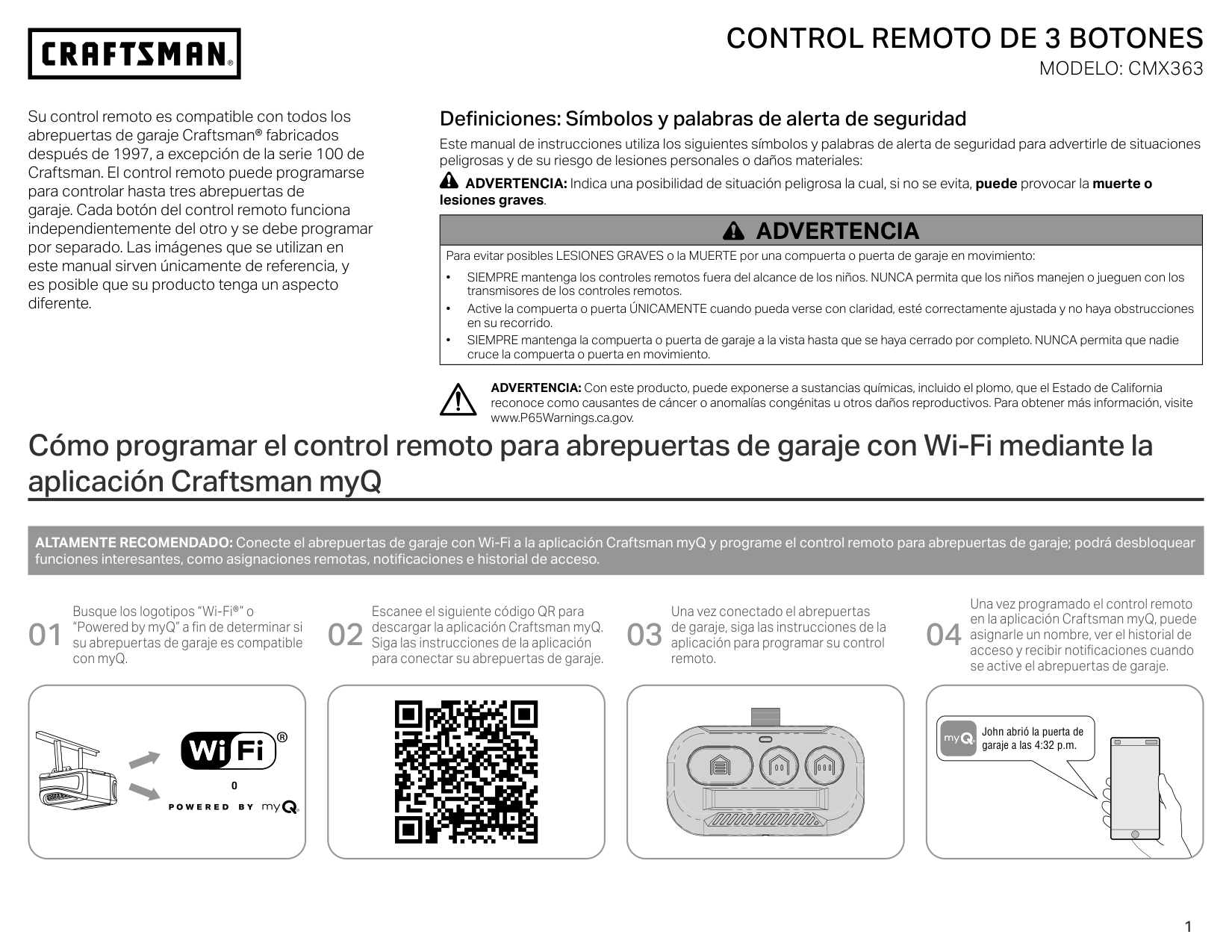 Su control remoto es compatible con todos los abrepuertas de garaje Craftsman® fabricados después de 1997, a excepción de la serie 100 de Craftsman. El control remoto puede programarse para controlar hasta tres abrepuertas de garaje. Cada botón del control remoto funciona independientemente del otro y se debe programar por separado. Las imágenes que se utilizan en este manual sirven únicamente de referencia, y es posible que su producto tenga un aspecto diferente. Cómo programar el control remoto para abrepuertas de garaje con Wi-Fi mediante la aplicación Craftsman myQ ALTAMENTE RECOMENDADO: Conecte el abrepuertas de garaje con Wi-Fi a la aplicación Craftsman myQ y programe el control remoto para abrepuertas de garaje; podrá desbloquear funciones interesantes, como asignaciones remotas, notificaciones e historial de acceso. 01 Busque los logotipos “Wi-Fi®” o “Powered by myQ” a fin de determinar si su abrepuertas de garaje es compatible con myQ. 02 Escanee el siguiente código QR para descargar la aplicación Craftsman myQ. Siga las instrucciones de la aplicación para conectar su abrepuertas de garaje. 03 Una vez conectado el abrepuertas de garaje, siga las instrucciones de la aplicación para programar su control remoto. 04 Una vez programado el control remoto en la aplicación Craftsman myQ, puede asignarle un nombre, ver el historial de acceso y recibir notificaciones cuando se active el abrepuertas de garaje.O
