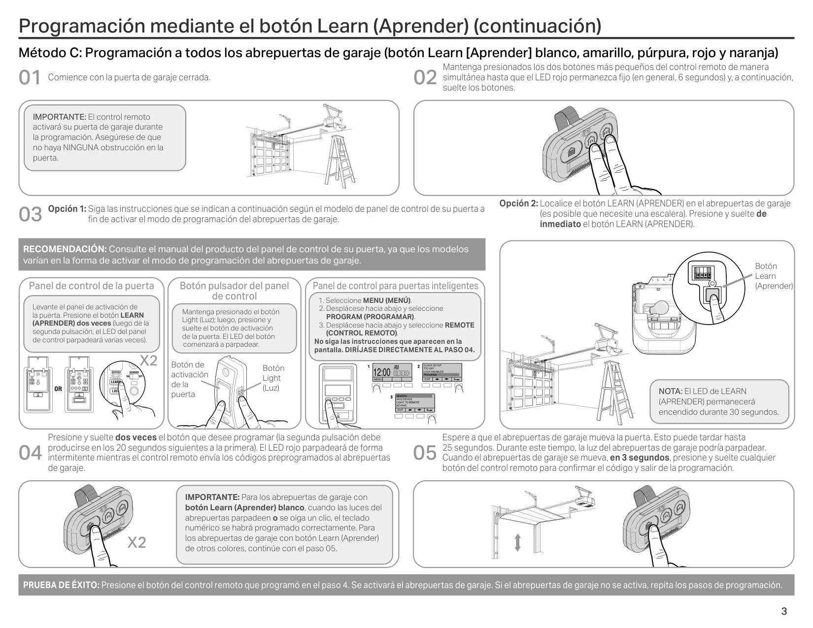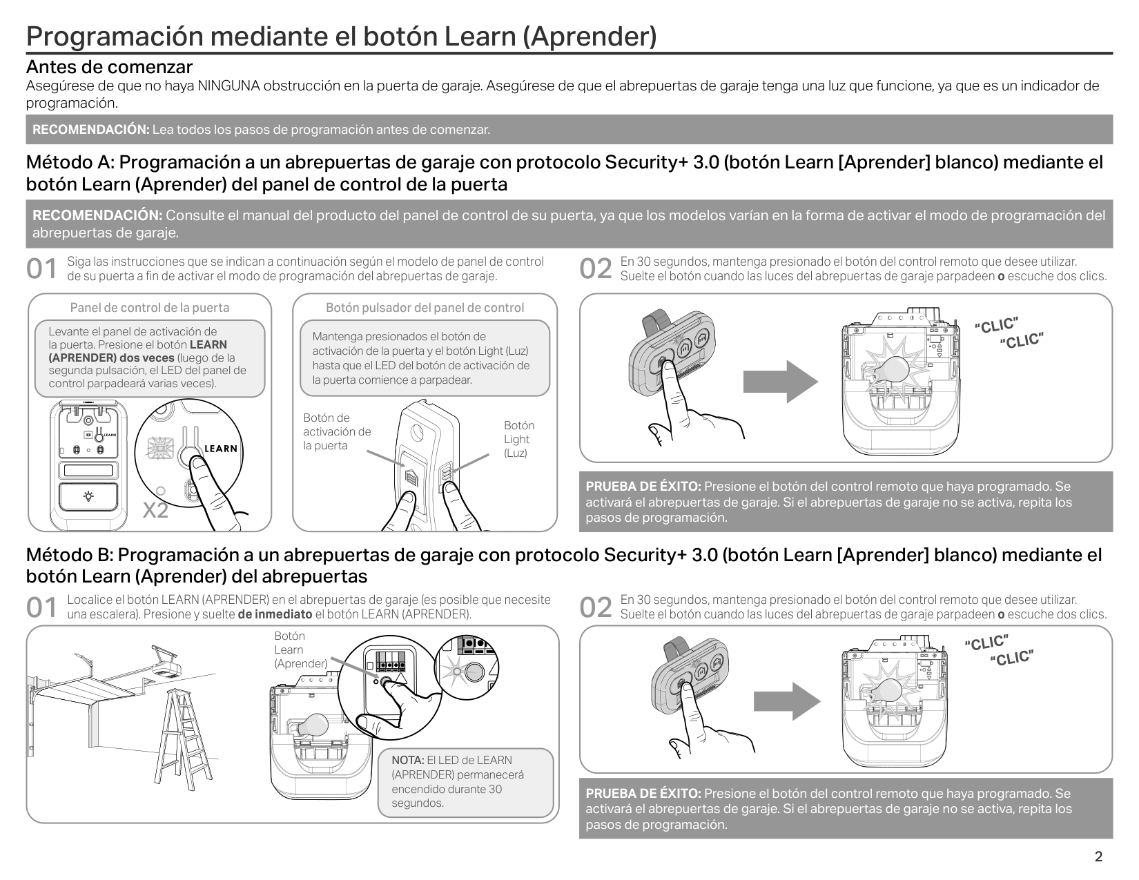 PRUEBA DE ÉXITO: Presione el botón del control remoto que haya programado. Se activará el abrepuertas de garaje. Si el abrepuertas de garaje no se activa, repita los pasos de programación.3 Programación mediante el botón Learn (Aprender) (continuación) Método C: Programación a todos los abrepuertas de garaje (botón Learn [Aprender] blanco, amarillo, púrpura, rojo y naranja) 01 Comience con la puerta de garaje cerrada. 02 Mantenga presionados los dos botones más pequeños del control remoto de manera simultánea hasta que el LED rojo permanezca fijo (en general, 6 segundos) y, a continuación, suelte los botones. IMPORTANTE: El control remoto activará su puerta de garaje durante la programación. Asegúrese de que no haya NINGUNA obstrucción en la puerta. 03 Opción 1: Siga las instrucciones que se indican a continuación según el modelo de panel de control de su puerta a fin de activar el modo de programación del abrepuertas de garaje. Opción 2: Localice el botón LEARN (APRENDER) en el abrepuertas de garaje (es posible que necesite una escalera). Presione y suelte de inmediato el botón LEARN (APRENDER). RECOMENDACIÓN: Consulte el manual del producto del panel de control de su puerta, ya que los modelos varían en la forma de activar el modo de programación del abrepuertas de garaje. Botón Learn (Aprender) NOTA: El LED de LEARN (APRENDER) permanecerá encendido durante 30 segundos.
