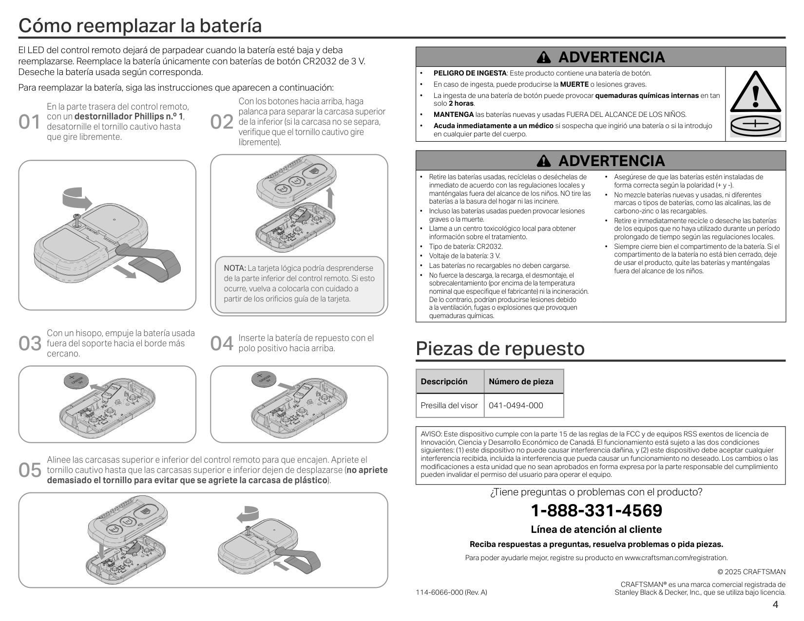 IMPORTANTE: Para los abrepuertas de garaje con botón Learn (Aprender) blanco, cuando las luces del abrepuertas parpadeen o se oiga un clic, el teclado numérico se habrá programado correctamente. Para los abrepuertas de garaje con botón Learn (Aprender) de otros colores, continúe con el paso 05. PRUEBA DE ÉXITO: Presione el botón del control remoto que programó en el paso 4. Se activará el abrepuertas de garaje. Si el abrepuertas de garaje no se activa, repita los pasos de programación.4 El LED del control remoto dejará de parpadear cuando la batería esté baja y deba reemplazarse. Reemplace la batería únicamente con baterías de botón CR2032 de 3 V. Deseche la batería usada según corresponda. Para reemplazar la batería, siga las instrucciones que aparecen a continuación: 01 En la parte trasera del control remoto, con un destornillador Phillips n.º 1, desatornille el tornillo cautivo hasta que gire libremente. 02 Con los botones hacia arriba, haga palanca para separar la carcasa superior de la inferior (si la carcasa no se separa, verifique que el tornillo cautivo gire libremente). NOTA: La tarjeta lógica podría desprenderse de la parte inferior del control remoto. Si esto ocurre, vuelva a colocarla con cuidado a partir de los orificios guía de la tarjeta. 03 Con un hisopo, empuje la batería usada fuera del soporte hacia el borde más cercano. 04 Inserte la batería de repuesto con el polo positivo hacia arriba. 05 Alinee las carcasas superior e inferior del control remoto para que encajen. Apriete el tornillo cautivo hasta que las carcasas superior e inferior dejen de desplazarse (no apriete demasiado el tornillo para evitar que se agriete la carcasa de plástico).