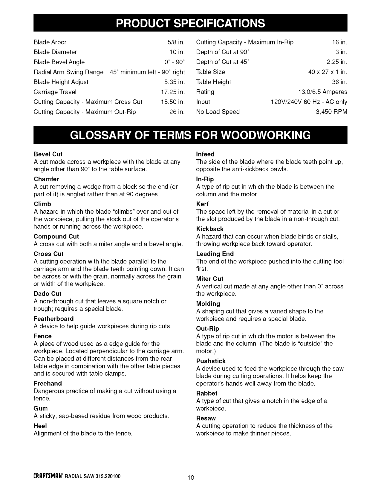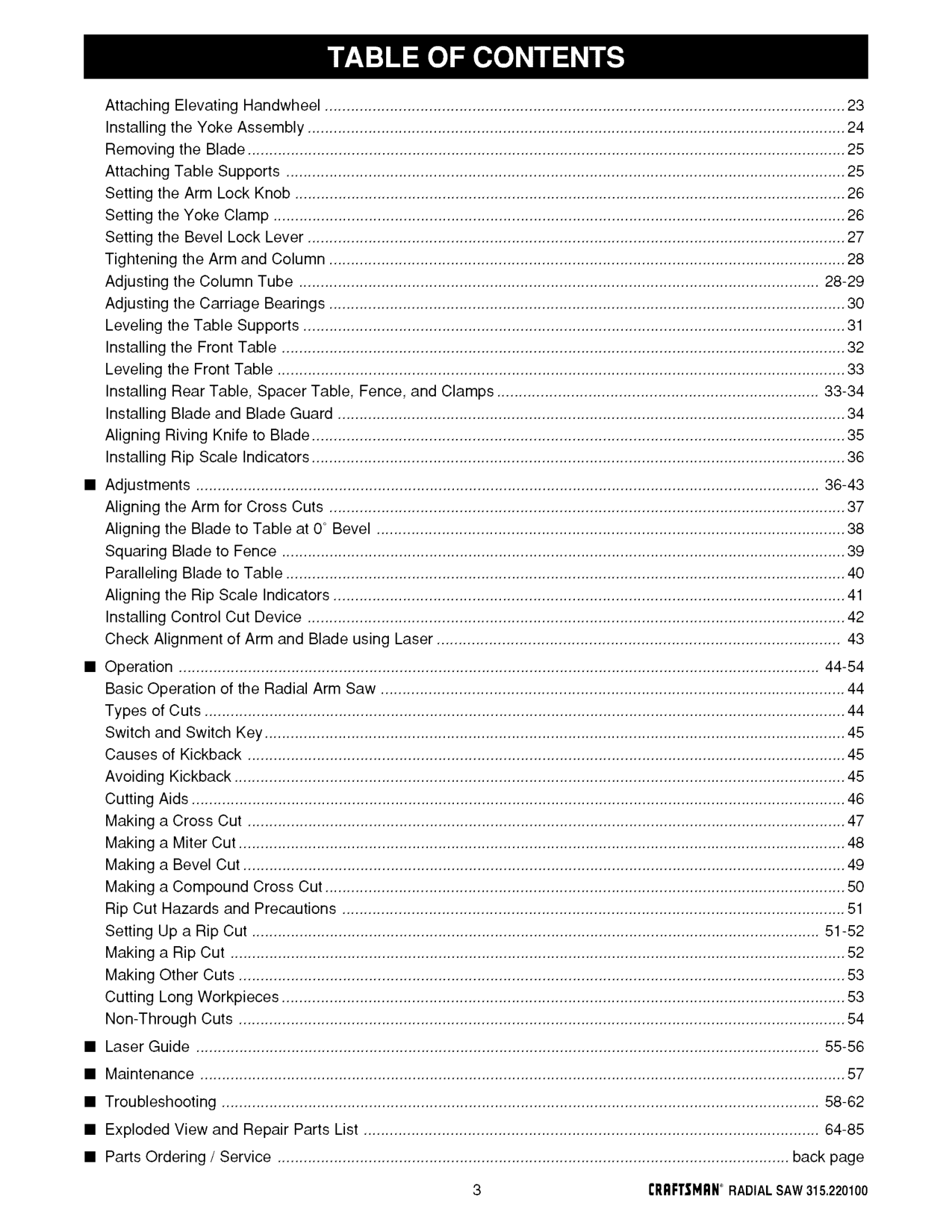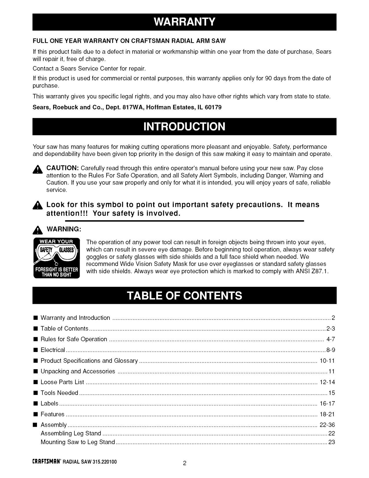 The operation of any power tool can result in foreign objects being thrown into your eyes, which can result in severe eye damage. Before beginning tool operation, always wear safety goggles or safety glasses with side shields and a full face shield when needed. We recommend Wide Vision Safety Mask for use over eyeglasses or standard safety glasses with side shields. Always wear eye protection which is marked to comply with ANSI Z87.1. • Warranty and Introduction .................................................................................................................................. 2 • Table of Contents ............................................................................................................................................. 2-3 • Rules for Safe Operation ................................................................................................................................ 4-7 • Electrical ........................................................................................................................................................... 8-9 • Product Specifications and Glossary .......................................................................................................... 10-11 • Unpacking and Accessories ............................................................................................................................. 11 • Loose Parts List .......................................................................................................................................... 12-14 • Tools Needed .................................................................................................................................................... 15 • Labels .......................................................................................................................................................... 16-17 • Features ...................................................................................................................................................... 18-21 • Assembly ..................................................................................................................................................... 22-36 Assembling Leg Stand ...................................................................................................................................... 22 Mounting Saw to Leg Stand .............................................................................................................................. 23 [RRFT._IvlI_N_RADIALSAW 315.220100 2Attaching Elevating Handwheel ........................................................................................................................ 23 Installing the Yoke Assembly ............................................................................................................................ 24 Removing the Blade .......................................................................................................................................... 25 Attaching Table Supports ................................................................................................................................. 25 Setting the Arm Lock Knob ............................................................................................................................... 26 Setting the Yoke Clamp .................................................................................................................................... 26 Setting the Bevel Lock Lever ............................................................................................................................ 27 Tightening the Arm and Column ....................................................................................................................... 28 Adjusting the Column Tube ........................................................................................................................ 28-29 Adjusting the Carriage Bearings ....................................................................................................................... 30 Leveling the Table Supports ............................................................................................................................. 31 Installing the Front Table .................................................................................................................................. 32 Leveling the Front Table ................................................................................................................................... 33 Installing Rear Table, Spacer Table, Fence, and Clamps .......................................................................... 33-34 Installing Blade and Blade Guard ..................................................................................................................... 34 Aligning Riving Knife to Blade ........................................................................................................................... 35 Installing Rip Scale Indicators ........................................................................................................................... 36 • Adjustments ................................................................................................................................................ 36-43 Aligning the Arm for Cross Cuts ....................................................................................................................... 37 Aligning the Blade to Table at 0° Bevel ............................................................................................................ 38 Squaring Blade to Fence .................................................................................................................................. 39 Paralleling Blade to Table ...........................................................................