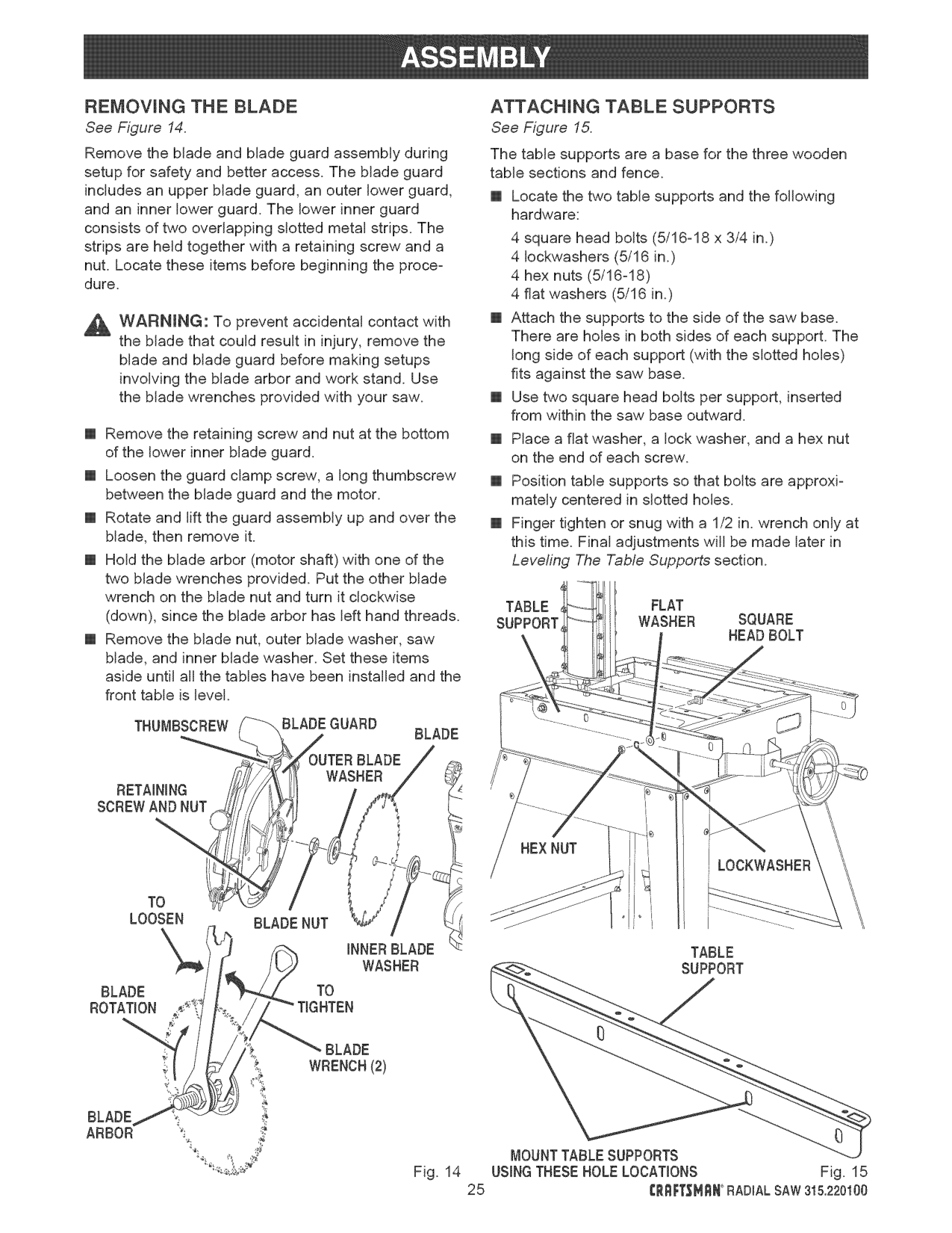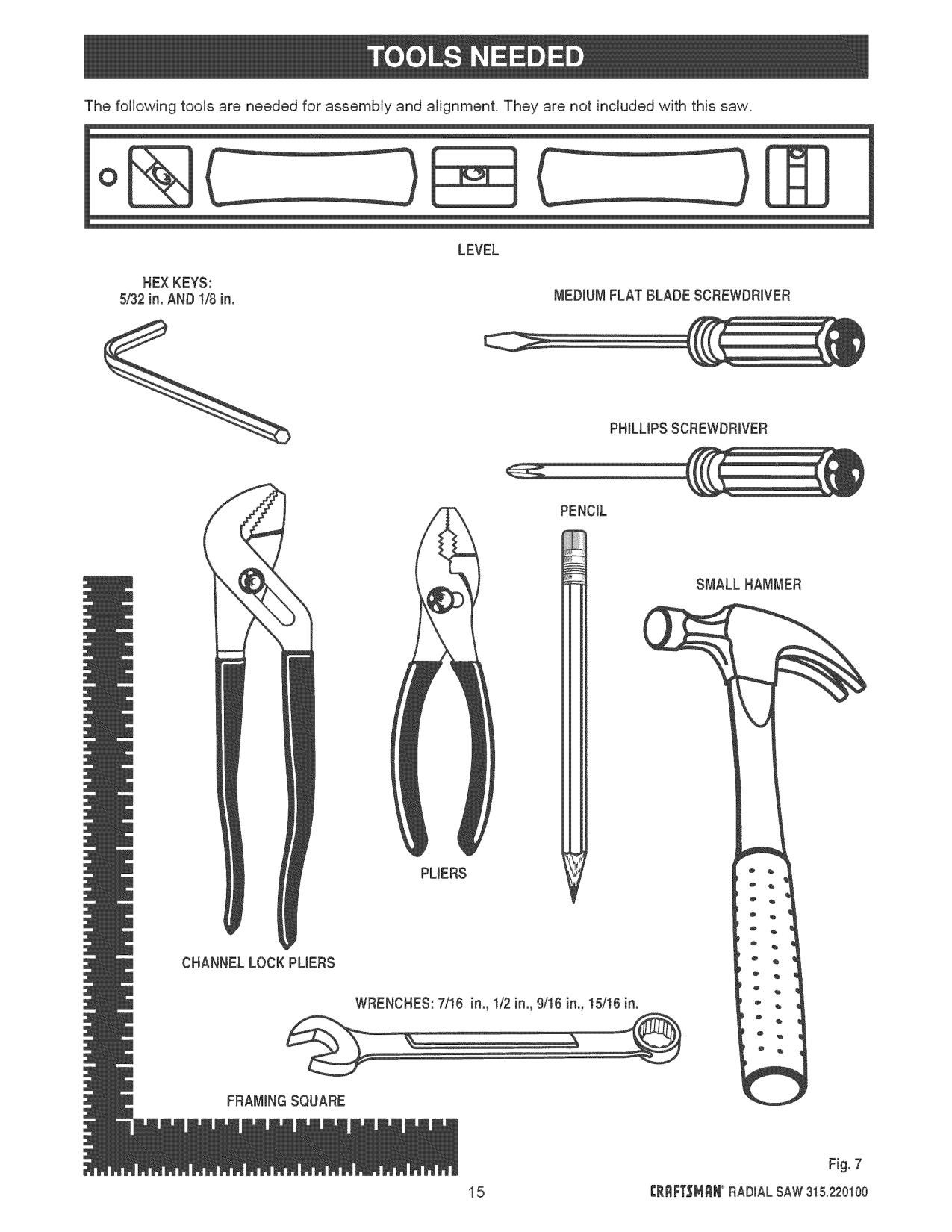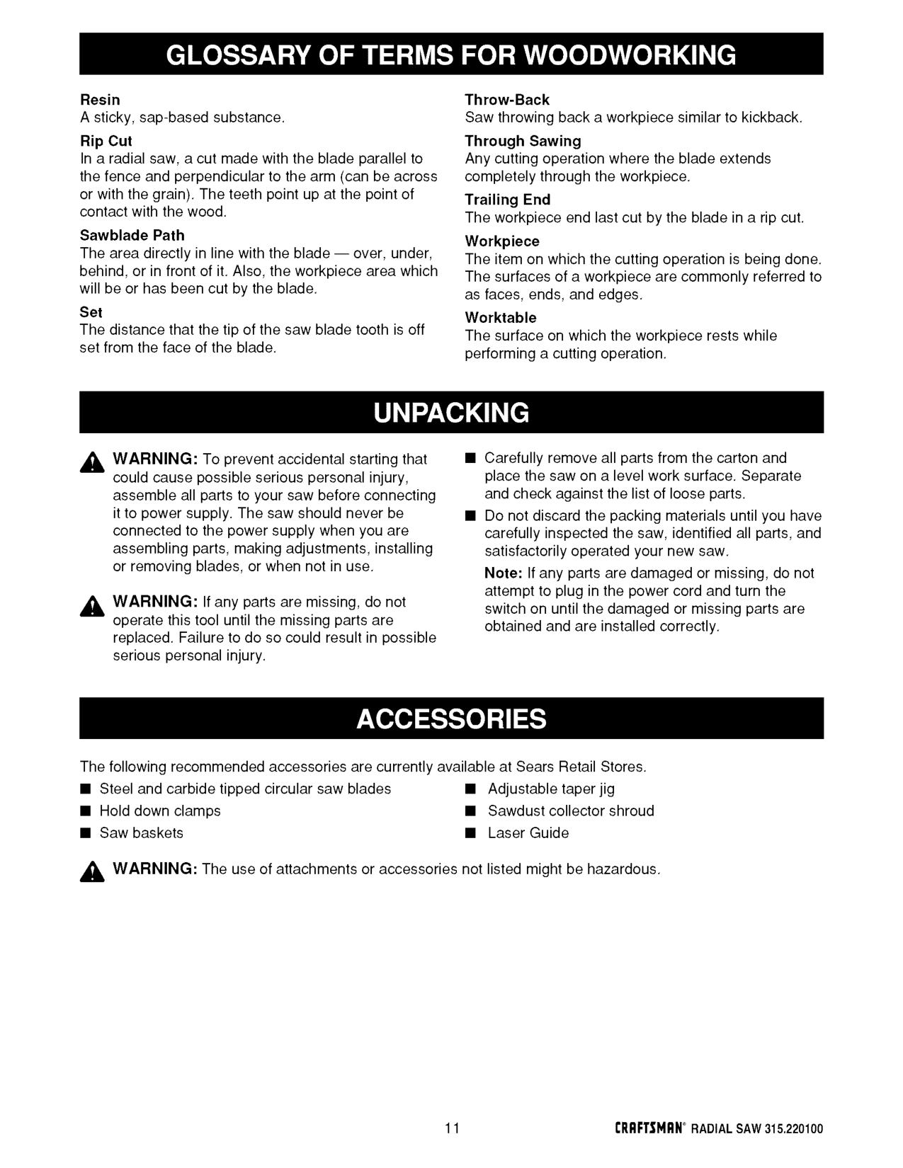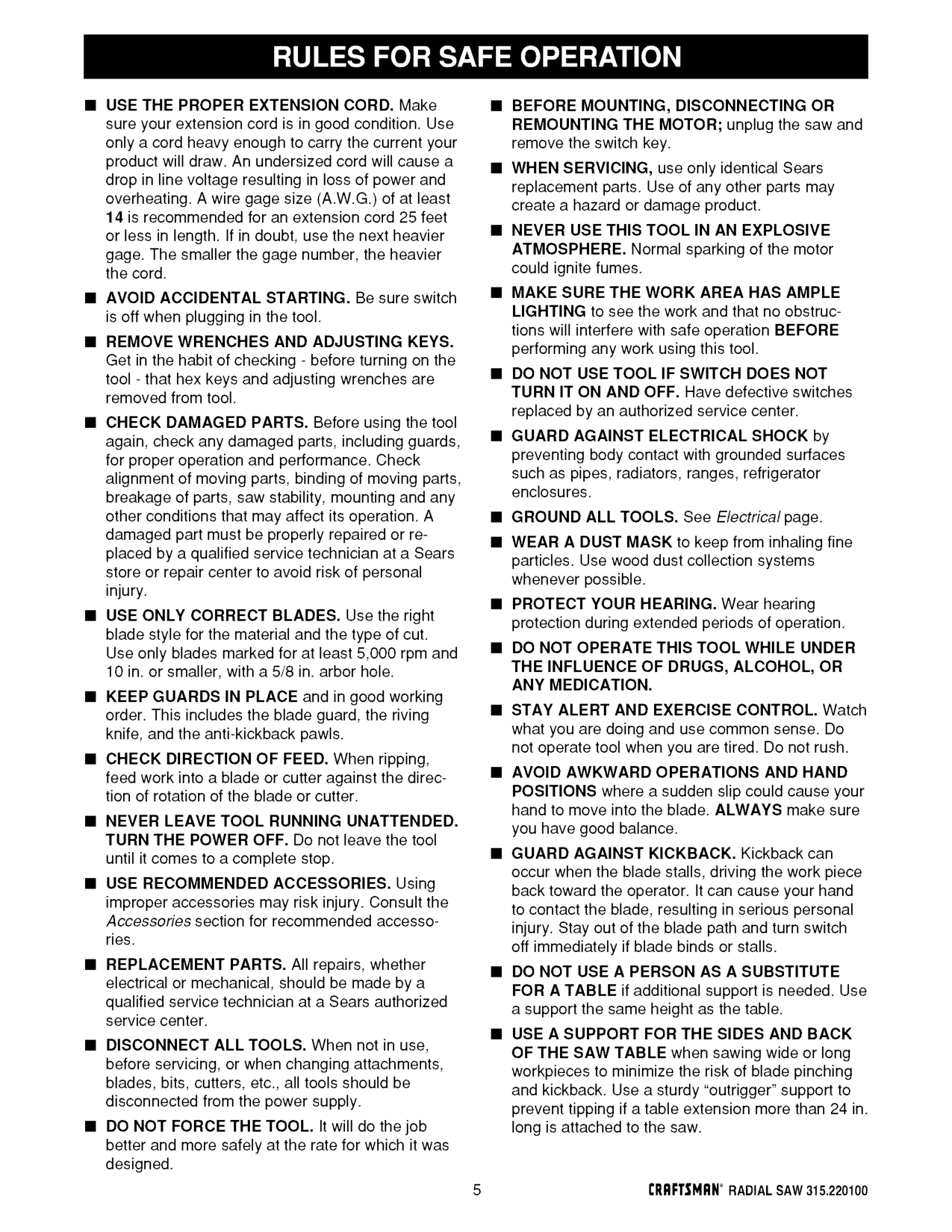 The operation of any power tool can result in foreign objects being thrown into your eyes, which can result in severe eye damage. Before beginning tool operation, always wear safety goggles or safety glasses with side shields and a full face shield when needed. We recommend Wide Vision Safety Mask for use over eyeglasses or standard safety glasses with side shields. Always wear eye protection which is marked to comply with ANSI Z87.1. • Warranty and Introduction .................................................................................................................................. 2 • Table of Contents ............................................................................................................................................. 2-3 • Rules for Safe Operation ................................................................................................................................ 4-7 • Electrical ........................................................................................................................................................... 8-9 • Product Specifications and Glossary .......................................................................................................... 10-11 • Unpacking and Accessories ............................................................................................................................. 11 • Loose Parts List .......................................................................................................................................... 12-14 • Tools Needed .................................................................................................................................................... 15 • Labels .......................................................................................................................................................... 16-17 • Features ...................................................................................................................................................... 18-21 • Assembly ..................................................................................................................................................... 22-36 Assembling Leg Stand ...................................................................................................................................... 22 Mounting Saw to Leg Stand .............................................................................................................................. 23 [RRFT._IvlI_N_RADIALSAW 315.220100 2Attaching Elevating Handwheel ........................................................................................................................ 23 Installing the Yoke Assembly ............................................................................................................................ 24 Removing the Blade .......................................................................................................................................... 25 Attaching Table Supports ................................................................................................................................. 25 Setting the Arm Lock Knob ............................................................................................................................... 26 Setting the Yoke Clamp .................................................................................................................................... 26 Setting the Bevel Lock Lever ............................................................................................................................ 27 Tightening the Arm and Column ....................................................................................................................... 28 Adjusting the Column Tube ........................................................................................................................ 28-29 Adjusting the Carriage Bearings ....................................................................................................................... 30 Leveling the Table Supports ............................................................................................................................. 31 Installing the Front Table .................................................................................................................................. 32 Leveling the Front Table ................................................................................................................................... 33 Installing Rear Table, Spacer Table, Fence, and Clamps .......................................................................... 33-34 Installing Blade and Blade Guard ..................................................................................................................... 34 Aligning Riving Knife to Blade ........................................................................................................................... 35 Installing Rip Scale Indicators ........................................................................................................................... 36 • Adjustments ................................................................................................................................................ 36-43 Aligning the Arm for Cross Cuts ....................................................................................................................... 37 Aligning the Blade to Table at 0° Bevel ............................................................................................................ 38 Squaring Blade to Fence .................................................................................................................................. 39 Paralleling Blade to Table ...........................................................................