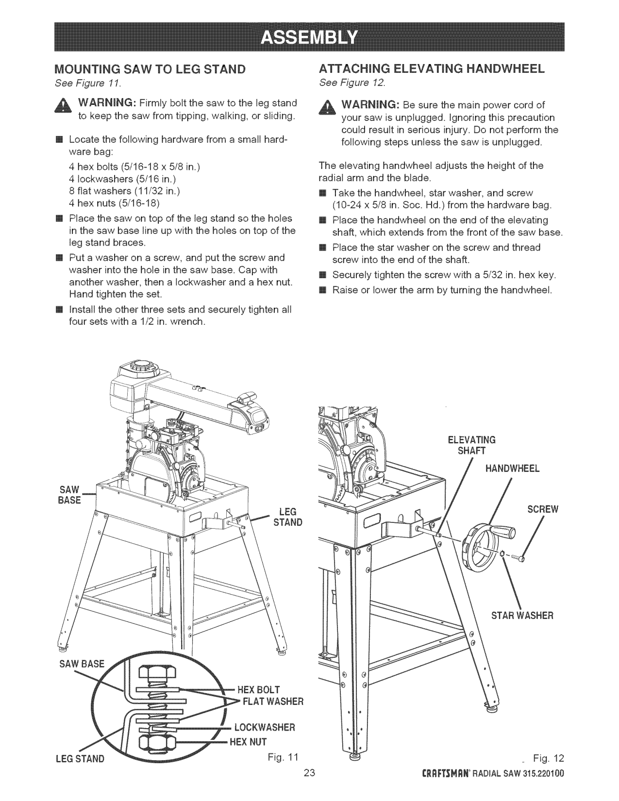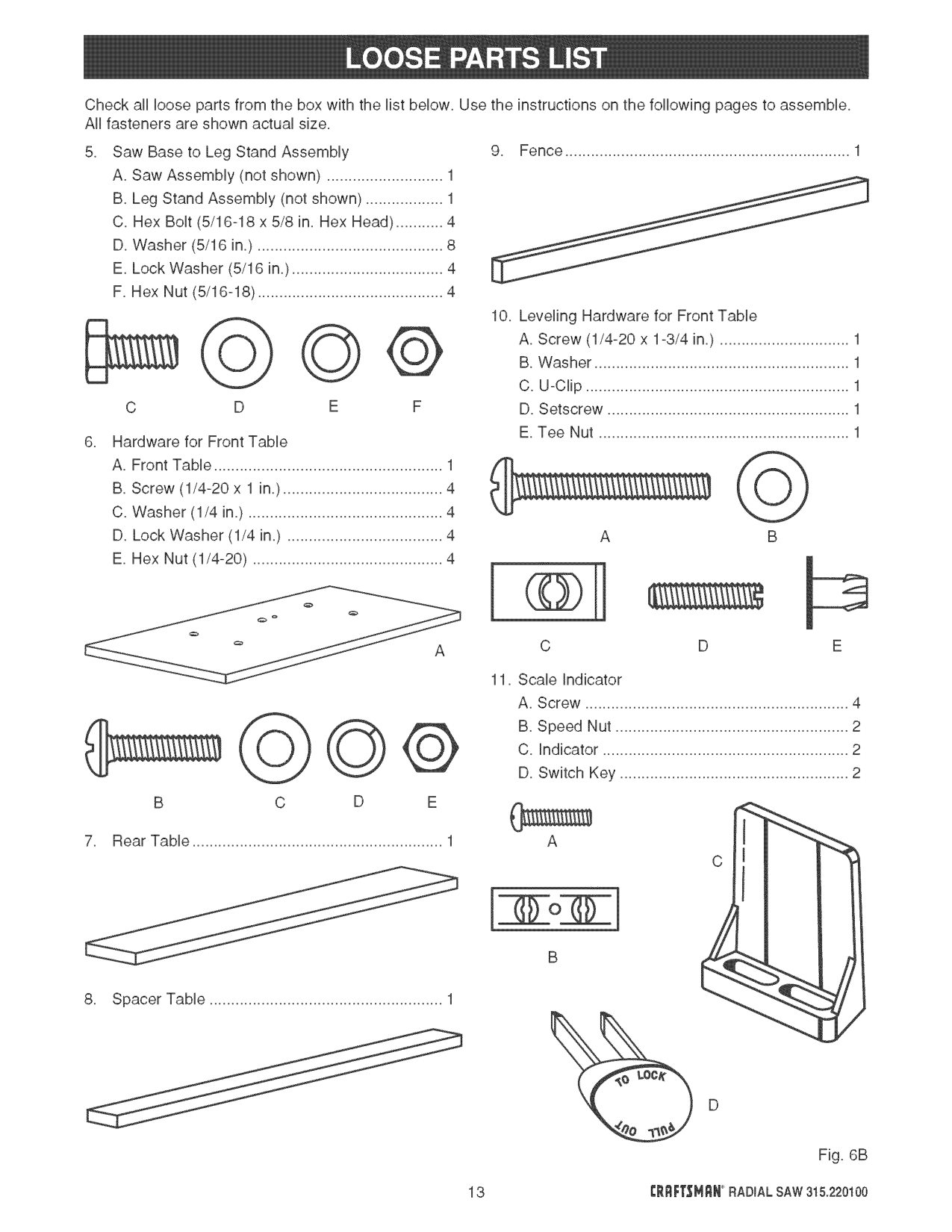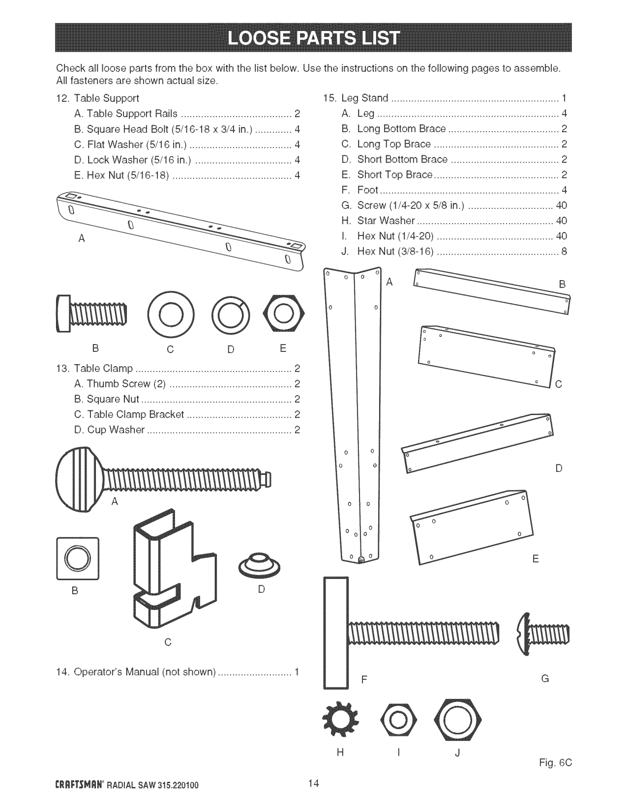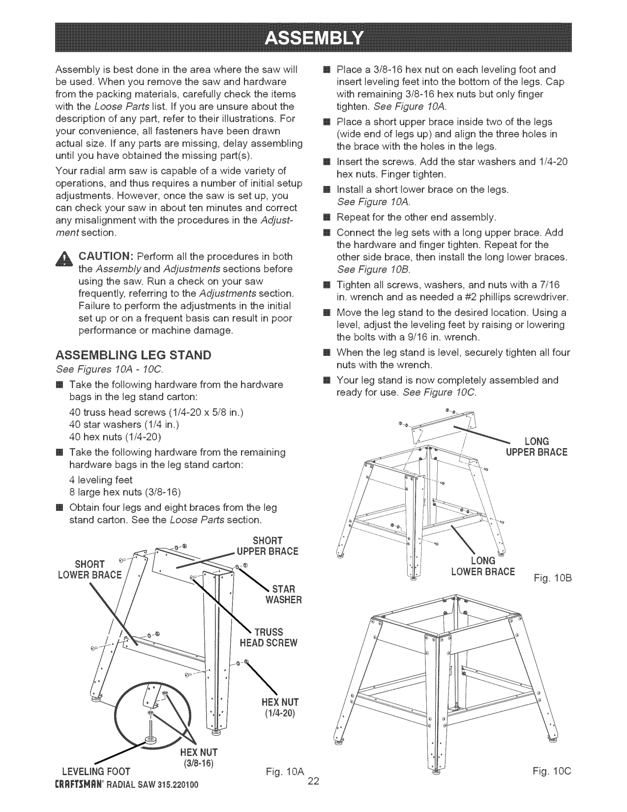 Lower Front/Rear Brace .................................................................................................................................... 2 Leg .................................................................................................................................................................... 4 Lower Side Brace .............................................................................................................................................. 2 Leveling Foot ..................................................................................................................................................... 4 Hex Nut (3/8-16) ................................................................................................................................................ 8 Hex Nut (1/4-20) .............................................................................................................................................. 40 Star Washer (1/4 in.) ...................................................................................................................................... 40 Screw (1/4-20 x 5/8 in. Truss Hd.) ................................................................................................................... 40 Side Brace ......................................................................................................................................................... 2 Front/Rear Brace ............................................................................................................................................... 2 Complete Leg Stand Assembly (Includes Items Listed Above)Craftsman