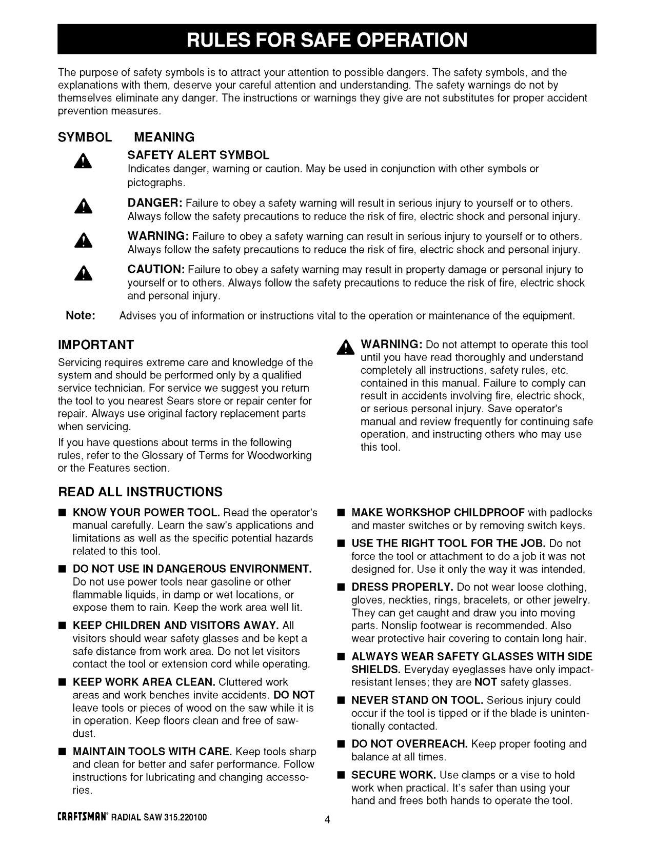 Carefully read through this entire operator's manual before using your new saw. Pay close attention to the Rules For Safe Operation, and all Safety Alert Symbols, including Danger, Warning and Caution. If you use your saw properly and only for what it is intended, you will enjoy years of safe, reliable service. Look for this symbol to point out important safety precautions. It means attention!!! Your safety is involved. _,Warning: