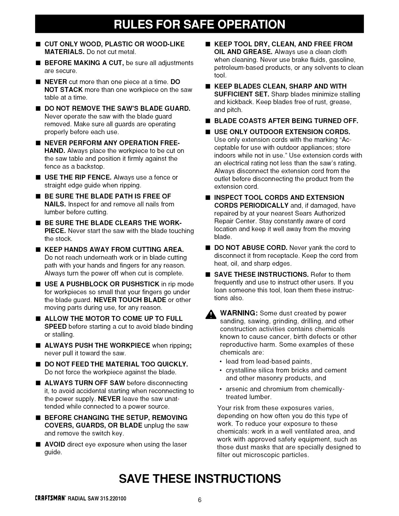 Model No. 315.220100 Save this manual for future reference.Caution: