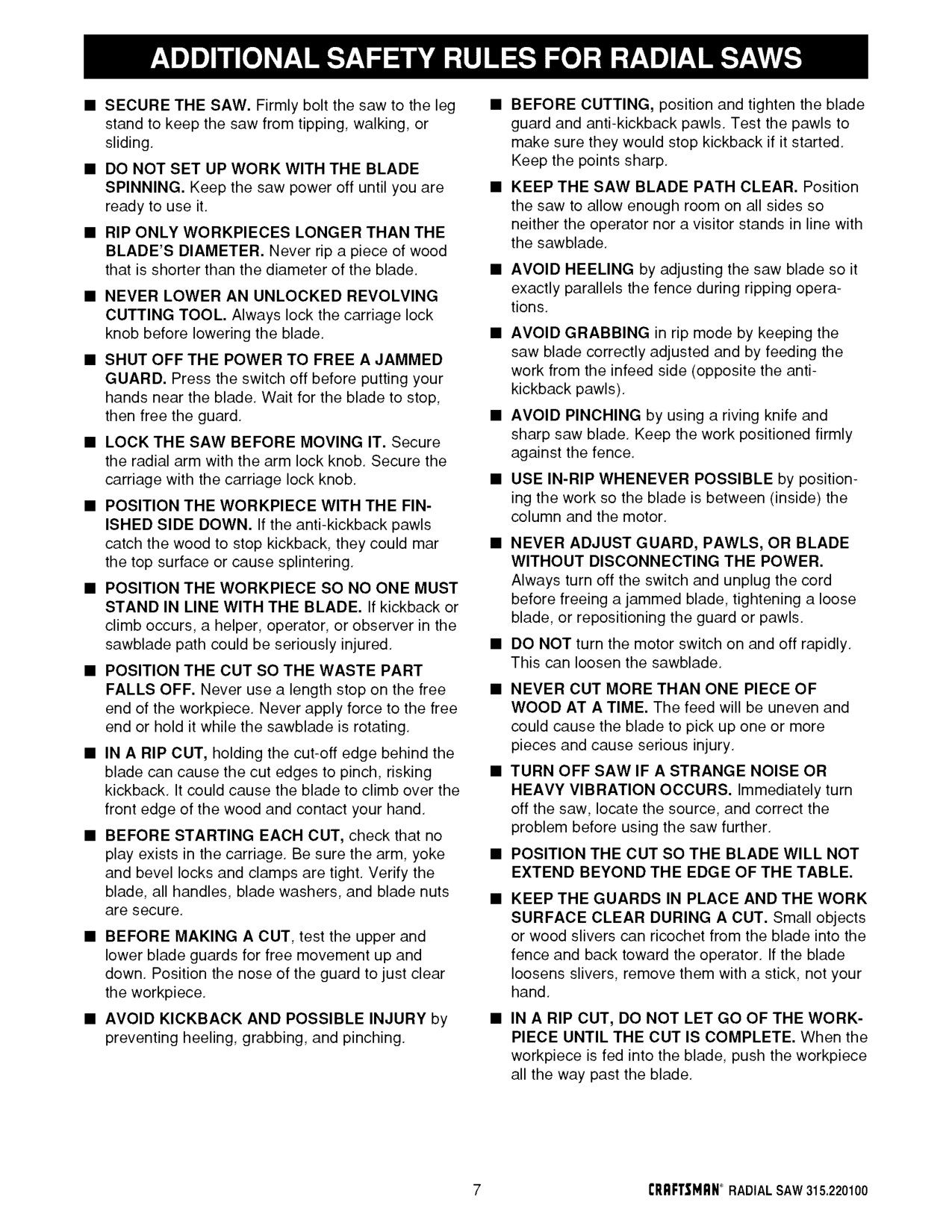Keep tools sharp and clean for better and safer performance, Follow instructions for lubricating and changing accesso- • ries, I:RRFI'$MnN"RADIALSAW 315.220100 •Make Workshop