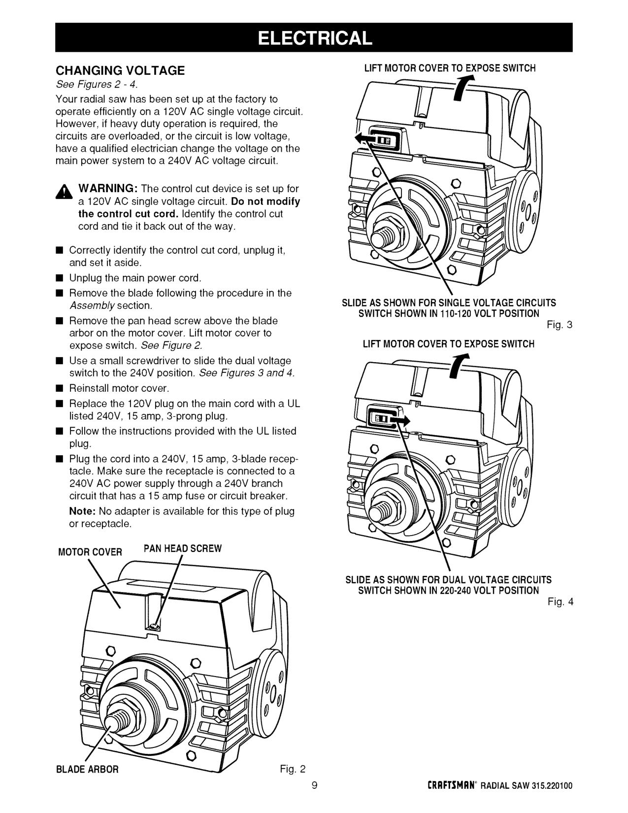 Have a qualified electrician change the voltage on the main power system. The procedure involves removing the blade, lifting the motor cover to expose the switch, using a small screwdriver to slide the dual voltage switch to the 240V position, and replacing the 120V plug with a UL listed 240V, 15 amp, 3-prong plug. Do not modify the control cut cord, which is set up for 120V AC only. (Page 9)