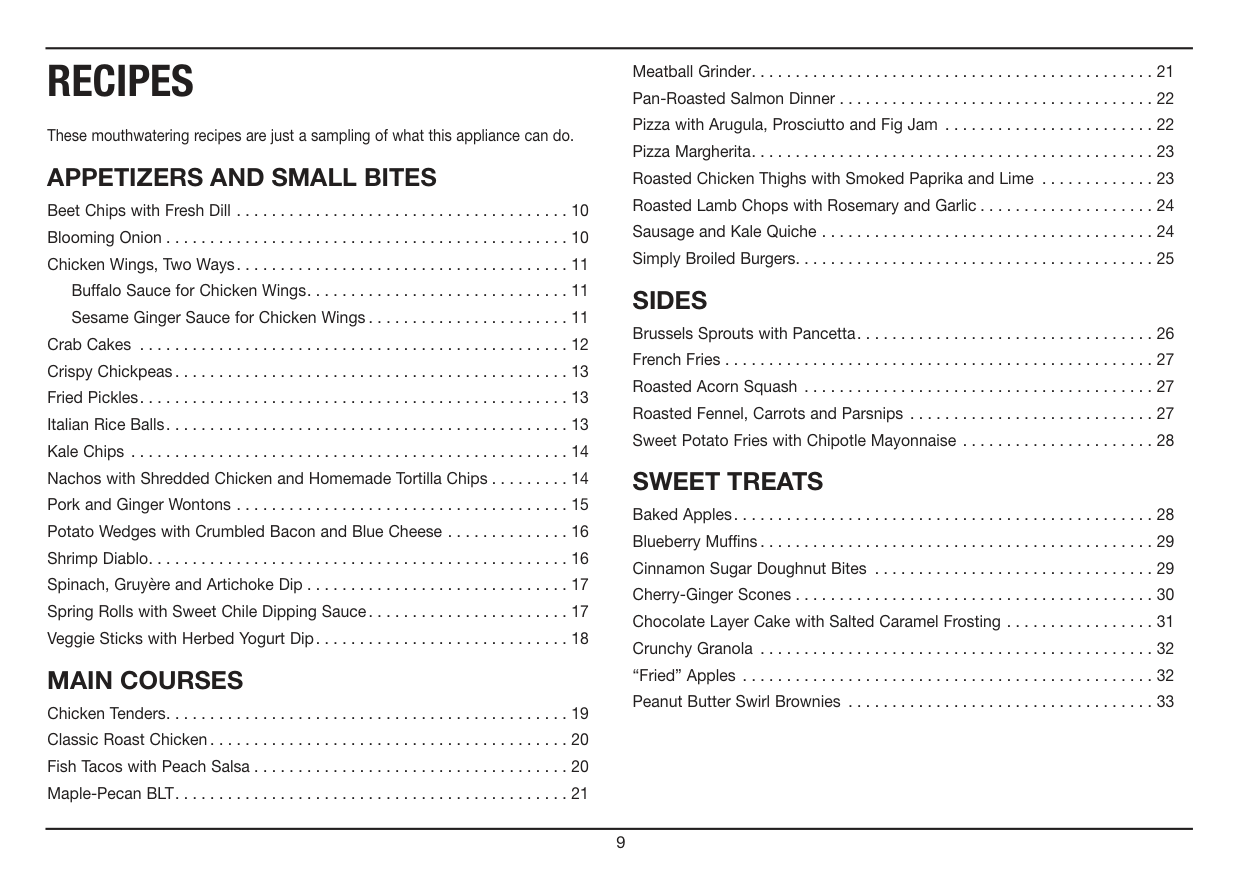 Beet Chips with Fresh Dill . . . . . . . . . . . . . . . . . . . . . . . . . . . . . . . . . . . . . . 10 Blooming Onion . . . . . . . . . . . . . . . . . . . . . . . . . . . . . . . . . . . . . . . . . . . . . . 10 Chicken Wings, Two Ways. . . . . . . . . . . . . . . . . . . . . . . . . . . . . . . . . . . . . . 11 Buffalo Sauce for Chicken Wings. . . . . . . . . . . . . . . . . . . . . . . . . . . . . . 11 Sesame Ginger Sauce for Chicken Wings . . . . . . . . . . . . . . . . . . . . . . . 11 Crab Cakes . . . . . . . . . . . . . . . . . . . . . . . . . . . . . . . . . . . . . . . . . . . . . . . . . 12 Crispy Chickpeas . . . . . . . . . . . . . . . . . . . . . . . . . . . . . . . . . . . . . . . . . . . . . 13 Fried Pickles. . . . . . . . . . . . . . . . . . . . . . . . . . . . . . . . . . . . . . . . . . . . . . . . . 13 Italian Rice Balls. . . . . . . . . . . . . . . . . . . . . . . . . . . . . . . . . . . . . . . . . . . . . . 13 Kale Chips . . . . . . . . . . . . . . . . . . . . . . . . . . . . . . . . . . . . . . . . . . . . . . . . . . 14 Nachos with Shredded Chicken and Homemade Tortilla Chips . . . . . . . . . 14 Pork and Ginger Wontons . . . . . . . . . . . . . . . . . . . . . . . . . . . . . . . . . . . . . . 15 Potato Wedges with Crumbled Bacon and Blue Cheese . . . . . . . . . . . . . . 16 Shrimp Diablo. . . . . . . . . . . . . . . . . . . . . . . . . . . . . . . . . . . . . . . . . . . . . . . . 16 Spinach, Gruyère and Artichoke Dip . . . . . . . . . . . . . . . . . . . . . . . . . . . . . . 17 Spring Rolls with Sweet Chile Dipping Sauce. . . . . . . . . . . . . . . . . . . . . . . 17 Veggie Sticks with Herbed Yogurt Dip. . . . . . . . . . . . . . . . . . . . . . . . . . . . . 18Main Courses
