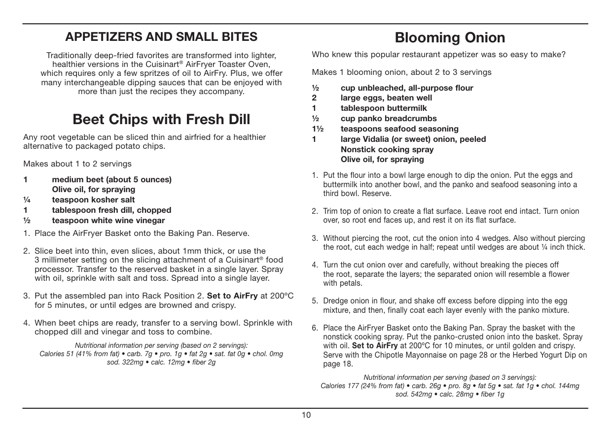 Traditionally deep-fried favorites are transformed into lighter, healthier versions in the Cuisinart® AirFryer Toaster Oven, which requires only a few spritzes of oil to AirFry. Plus, we offer many interchangeable dipping sauces that can be enjoyed with more than just the recipes they accompany. Beet Chips with Fresh Dill Any root vegetable can be sliced thin and airfried for a healthier alternative to packaged potato chips. Makes about 1 to 2 servings 1 medium beet (about 5 ounces)Olive oil, for spraying ¼ teaspoon kosher salt 1 tablespoon fresh dill, chopped ½ teaspoon white wine vinegar