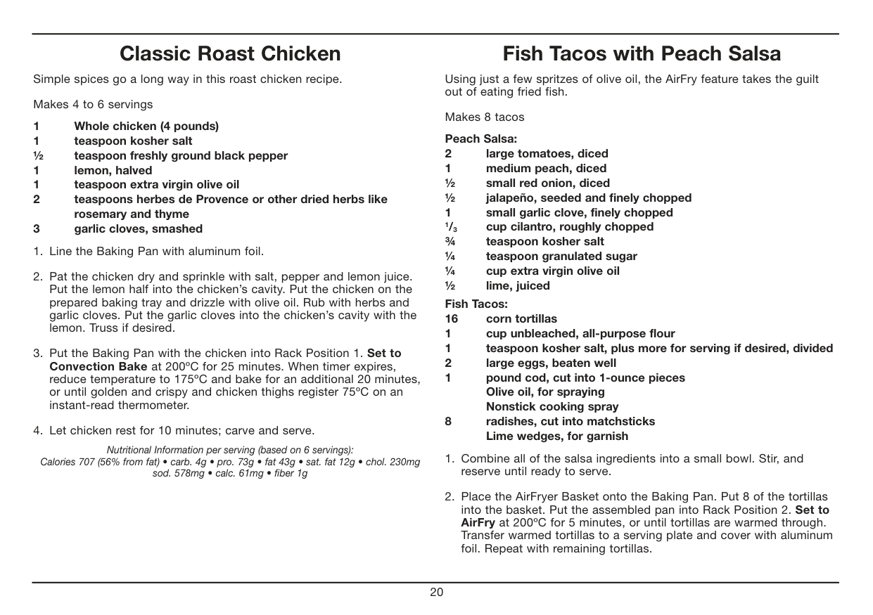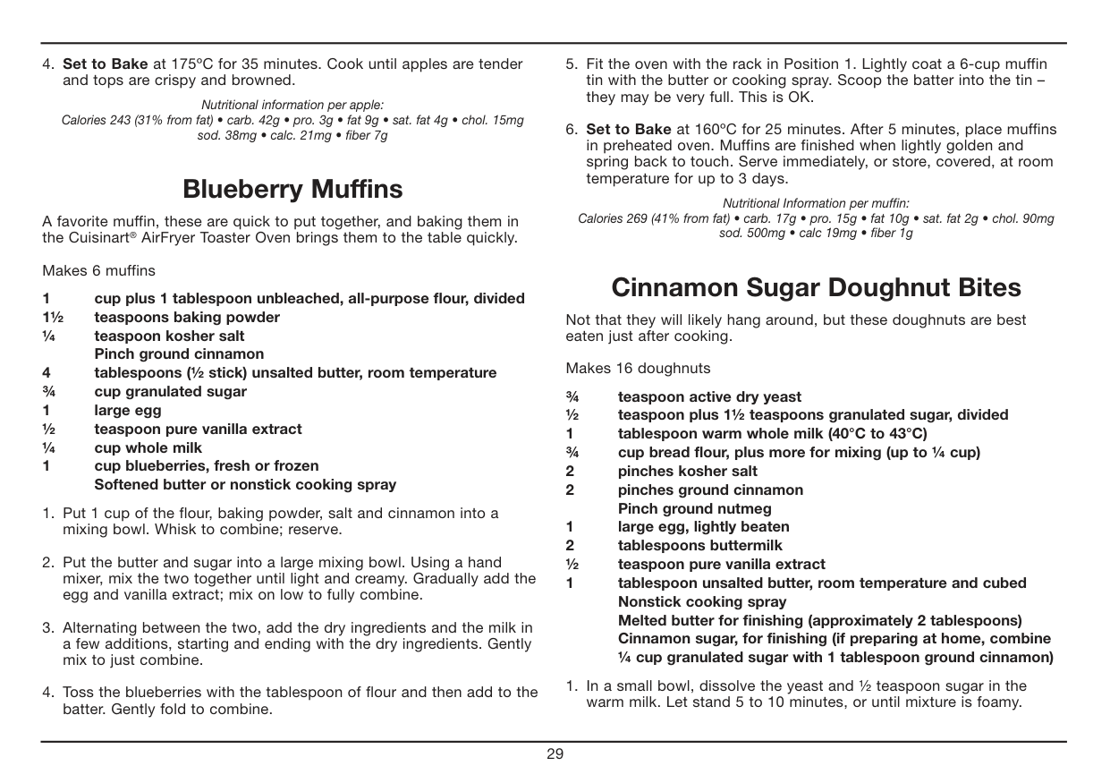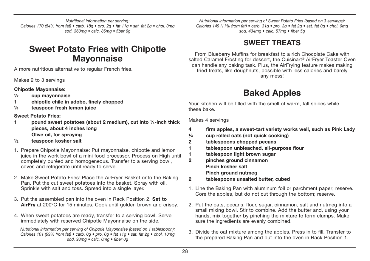 All of our recipes have been tested in our test kitchen and are specially developed to work in the Cuisinart® AirFryer Toaster Oven. Warm Fit provided Baking Pan or Oven Rack into Rack Position 2. Set the Temperature Dial to Warm. Set the Function Dial to Warm. Then turn the ON/ Oven Timer Dial to the desired warming time to start the oven and begin warming. The power light will illuminate. The timer will ring once when the cycle is complete and the oven will power off when the time expires. To stop warming, turn the ON/Oven Timer dial to the OFF position. Toast Fit Oven Rack into Position 2. If toasting two items, center them in the middle of the Oven Rack. Four items should be evenly spaced – two in front, two in back. Six items should be evenly spaced – three in front, three in back. Set the Function Dial to Toast. Set the Temperature Dial to Toast/Broil. Turn the ON/ Toast Timer Dial to desired shade setting from light to dark within the marked settings to turn on the oven and begin toasting. The oven power light will illuminate. When completed, the timer will ring and turn off.7 To stop toasting, turn the ON/Toast Timer dial to the OFF position. Important Notes on Toasting The Oven Rack must be in Position 2 as indicated in the diagram on page 5. AirFry (Refer to Chart on page 8) Place the AirFryer Basket onto the Baking Pan. AirFry in Rack Position 2. Set the Function Dial to AirFry. Set Temperature Dial to desired temperature. Then turn the ON/Oven Timer dial to the desired cooking time to turn on the oven and begin AirFrying. The oven power light will illuminate. The timer will ring once when the cycle is complete, and the oven will power off when the time expires. To stop AirFrying, turn the ON/Oven Timer dial to the OFF position. AirFrying Tips: AirFrying is a healthy alternative to frying. Many foods that can be fried, can be AirFried without using excess amounts of oil. AirFried foods will taste lighter and less greasy than deep-fried foods. Most oils can be used for AirFrying. Olive oil is preferred for a richer flavor. Vegetable, canola or grapeseed oil is recommended for a mild flavor. Distribute oil evenly on food to achieve the crispiest and most golden results. Oil can be sprayed or brushed onto foods for AirFrying. Alternatively, olive oil and non stick cooking sprays can be used. An assortment of coatings can be used on AirFry foods. Some examples of different crumb mixtures include: breadcrumbs, seasoned breadcrumbs, panko breadcrumbs, cornflakes, potato chip crumbs, graham cracker crumbs, quinoa, various flours, etc. Most foods do not need to be flipped during cooking, but larger items, like chicken cutlets, should be flipped halfway during cooking to ensure quick, even cooking and browning. When AirFrying large quantities of food that crowd the pan, toss food halfway through cooking to ensure even cooking and coloring. Use higher temperatures for foods that cook quickly, like bacon and chips, and lower temperatures for foods that take longer to cook like breaded chicken. Foods will cook more evenly if they are cut to the same size. Line the Baking Tray with aluminum foil for easy cleanup. Please note that when most foods cook, they release water. When cooking large quantities for an extended period of time, condensation may build up, which could leave moisture on your countertop.