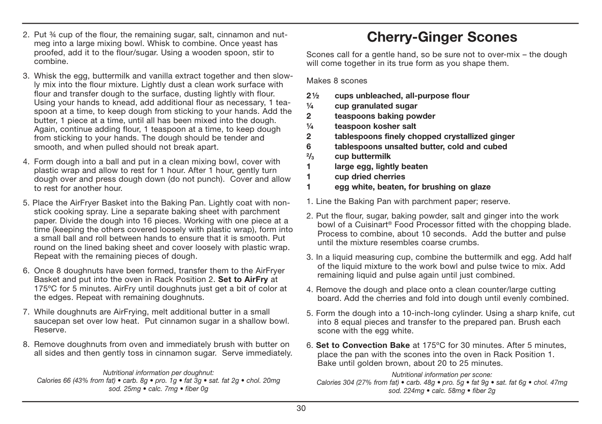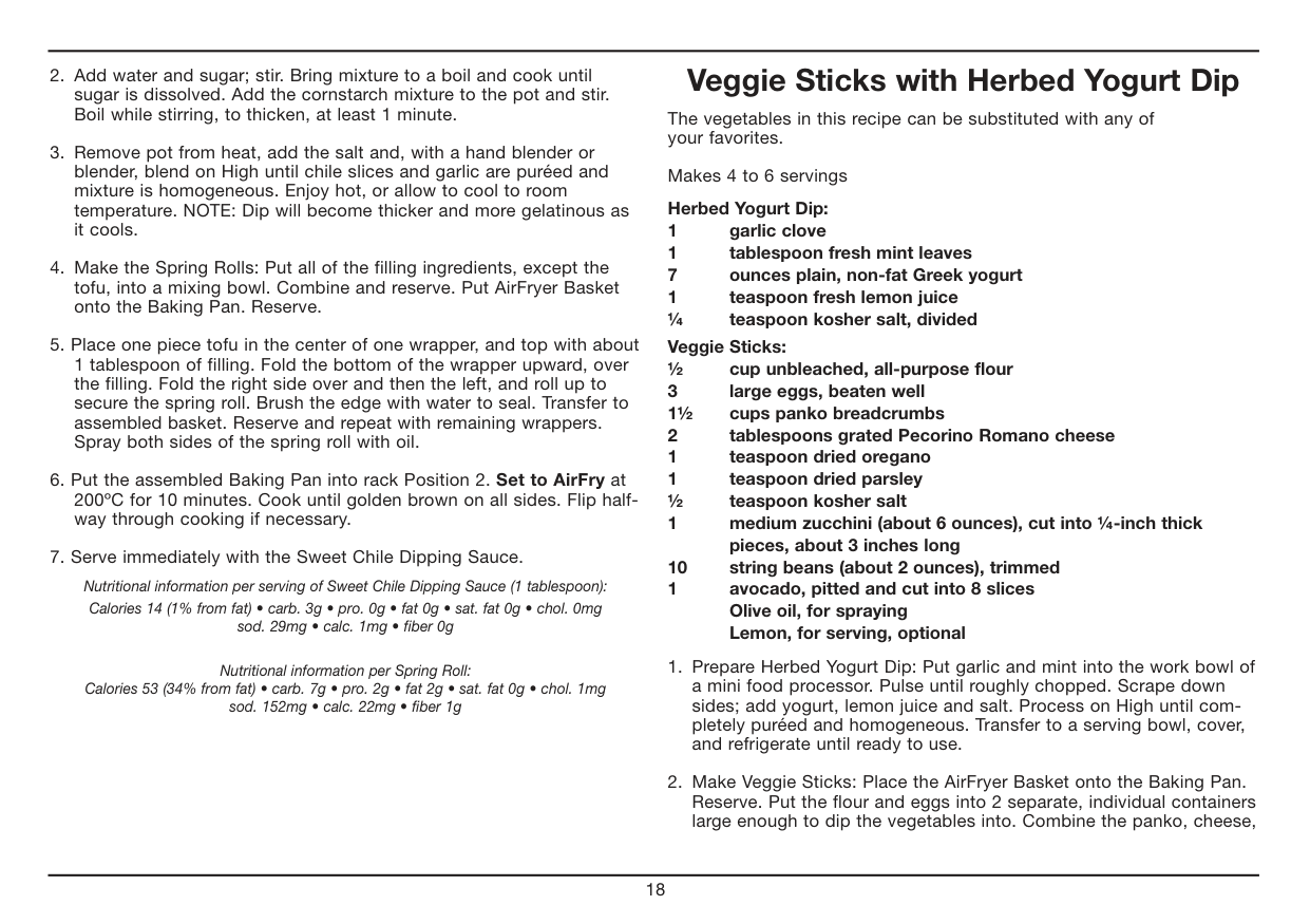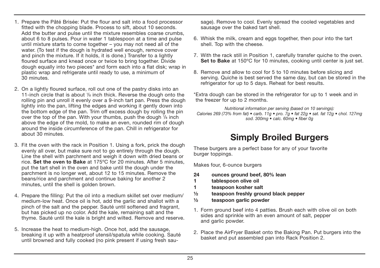 All of our recipes have been tested in our test kitchen and are specially developed to work in the Cuisinart® AirFryer Toaster Oven. Warm Fit provided Baking Pan or Oven Rack into Rack Position 2. Set the Temperature Dial to Warm. Set the Function Dial to Warm. Then turn the ON/ Oven Timer Dial to the desired warming time to start the oven and begin warming. The power light will illuminate. The timer will ring once when the cycle is complete and the oven will power off when the time expires. To stop warming, turn the ON/Oven Timer dial to the OFF position. Toast Fit Oven Rack into Position 2. If toasting two items, center them in the middle of the Oven Rack. Four items should be evenly spaced – two in front, two in back. Six items should be evenly spaced – three in front, three in back. Set the Function Dial to Toast. Set the Temperature Dial to Toast/Broil. Turn the ON/ Toast Timer Dial to desired shade setting from light to dark within the marked settings to turn on the oven and begin toasting. The oven power light will illuminate. When completed, the timer will ring and turn off.7 To stop toasting, turn the ON/Toast Timer dial to the OFF position. Important Notes on Toasting The Oven Rack must be in Position 2 as indicated in the diagram on page 5. AirFry (Refer to Chart on page 8) Place the AirFryer Basket onto the Baking Pan. AirFry in Rack Position 2. Set the Function Dial to AirFry. Set Temperature Dial to desired temperature. Then turn the ON/Oven Timer dial to the desired cooking time to turn on the oven and begin AirFrying. The oven power light will illuminate. The timer will ring once when the cycle is complete, and the oven will power off when the time expires. To stop AirFrying, turn the ON/Oven Timer dial to the OFF position. AirFrying Tips: AirFrying is a healthy alternative to frying. Many foods that can be fried, can be AirFried without using excess amounts of oil. AirFried foods will taste lighter and less greasy than deep-fried foods. Most oils can be used for AirFrying. Olive oil is preferred for a richer flavor. Vegetable, canola or grapeseed oil is recommended for a mild flavor. Distribute oil evenly on food to achieve the crispiest and most golden results. Oil can be sprayed or brushed onto foods for AirFrying. Alternatively, olive oil and non stick cooking sprays can be used. An assortment of coatings can be used on AirFry foods. Some examples of different crumb mixtures include: breadcrumbs, seasoned breadcrumbs, panko breadcrumbs, cornflakes, potato chip crumbs, graham cracker crumbs, quinoa, various flours, etc. Most foods do not need to be flipped during cooking, but larger items, like chicken cutlets, should be flipped halfway during cooking to ensure quick, even cooking and browning. When AirFrying large quantities of food that crowd the pan, toss food halfway through cooking to ensure even cooking and coloring. Use higher temperatures for foods that cook quickly, like bacon and chips, and lower temperatures for foods that take longer to cook like breaded chicken. Foods will cook more evenly if they are cut to the same size. Line the Baking Tray with aluminum foil for easy cleanup. Please note that when most foods cook, they release water. When cooking large quantities for an extended period of time, condensation may build up, which could leave moisture on your countertop.