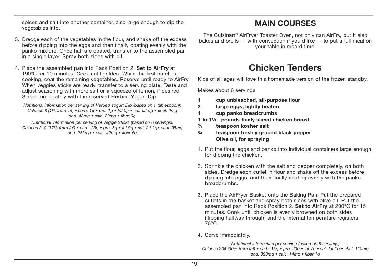 The Cuisinart® AirFryer Toaster Oven, not only can AirFry, but it also bakes and broils — with convection if you’d like — to put a full meal on your table in record time! Chicken Tenders Kids of all ages will love this homemade version of the frozen standby. Makes about 6 servings 1 cup unbleached, all-purpose flour 2 large eggs, lightly beaten 1 cup panko breadcrumbs 1 to 1½ pounds thinly sliced chicken breast ¾ teaspoon kosher salt ¾ teaspoon freshly ground black pepperOlive oil, for spraying
