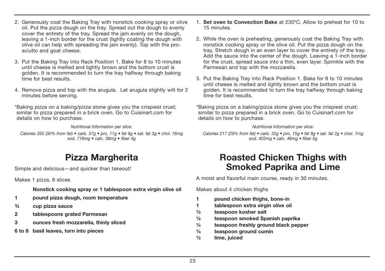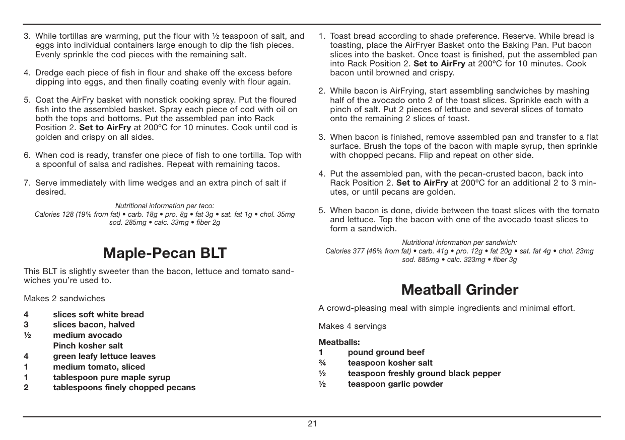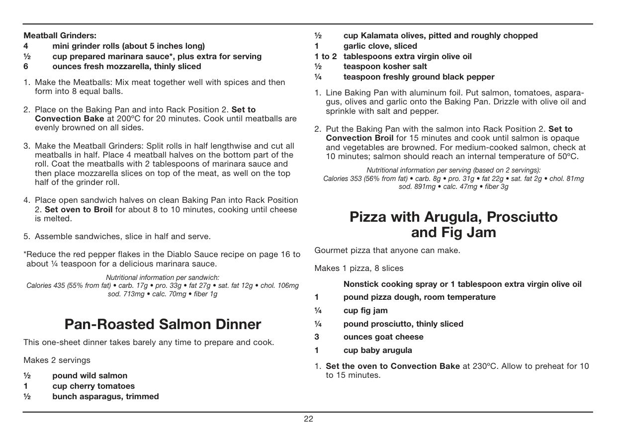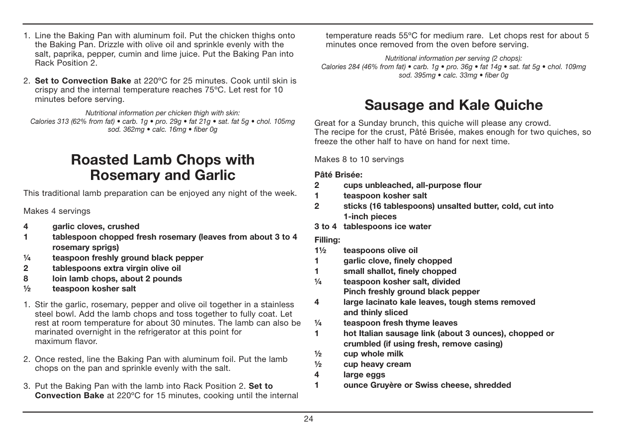 Chicken Tenders. . . . . . . . . . . . . . . . . . . . . . . . . . . . . . . . . . . . . . . . . . . . . . 19 Classic Roast Chicken . . . . . . . . . . . . . . . . . . . . . . . . . . . . . . . . . . . . . . . . . 20 Fish Tacos with Peach Salsa . . . . . . . . . . . . . . . . . . . . . . . . . . . . . . . . . . . . 20 Maple-Pecan BLT. . . . . . . . . . . . . . . . . . . . . . . . . . . . . . . . . . . . . . . . . . . . . 21 Meatball Grinder. . . . . . . . . . . . . . . . . . . . . . . . . . . . . . . . . . . . . . . . . . . . . . 21 Pan-Roasted Salmon Dinner . . . . . . . . . . . . . . . . . . . . . . . . . . . . . . . . . . . . 22 Pizza with Arugula, Prosciutto and Fig Jam . . . . . . . . . . . . . . . . . . . . . . . . 22 Pizza Margherita. . . . . . . . . . . . . . . . . . . . . . . . . . . . . . . . . . . . . . . . . . . . . . 23 Roasted Chicken Thighs with Smoked Paprika and Lime . . . . . . . . . . . . . 23 Roasted Lamb Chops with Rosemary and Garlic . . . . . . . . . . . . . . . . . . . . 24 Sausage and Kale Quiche . . . . . . . . . . . . . . . . . . . . . . . . . . . . . . . . . . . . . . 24 Simply Broiled Burgers. . . . . . . . . . . . . . . . . . . . . . . . . . . . . . . . . . . . . . . . . 25Sides