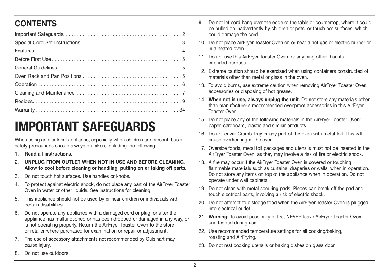 Important Safeguards. . . . . . . . . . . . . . . . . . . . . . . . . . . . . . . . . . . . . . . . . . . 2 Special Cord Set Instructions . . . . . . . . . . . . . . . . . . . . . . . . . . . . . . . . . . . . 3 Features . . . . . . . . . . . . . . . . . . . . . . . . . . . . . . . . . . . . . . . . . . . . . . . . . . . . . 4 Before First Use . . . . . . . . . . . . . . . . . . . . . . . . . . . . . . . . . . . . . . . . . . . . . . . 5 General Guidelines. . . . . . . . . . . . . . . . . . . . . . . . . . . . . . . . . . . . . . . . . . . . . 5 Oven Rack and Pan Positions . . . . . . . . . . . . . . . . . . . . . . . . . . . . . . . . . . . . 5 Operation . . . . . . . . . . . . . . . . . . . . . . . . . . . . . . . . . . . . . . . . . . . . . . . . . . . . 6 Cleaning and Maintenance . . . . . . . . . . . . . . . . . . . . . . . . . . . . . . . . . . . . . . 7 Recipes. . . . . . . . . . . . . . . . . . . . . . . . . . . . . . . . . . . . . . . . . . . . . . . . . . . . . . 9 Warranty . . . . . . . . . . . . . . . . . . . . . . . . . . . . . . . . . . . . . . . . . . . . . . . . . . . . 34Important Safeguards