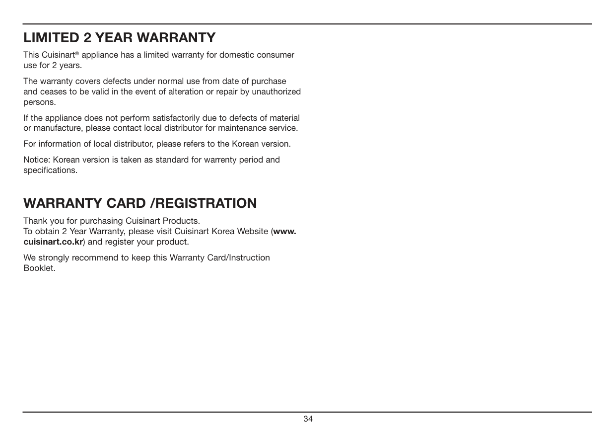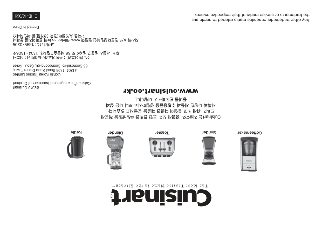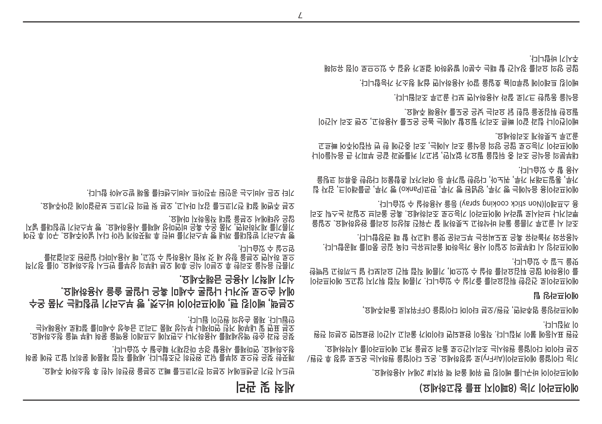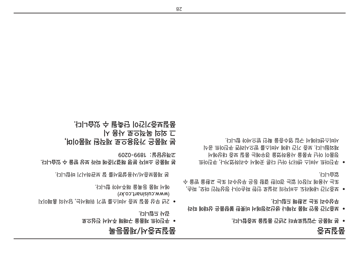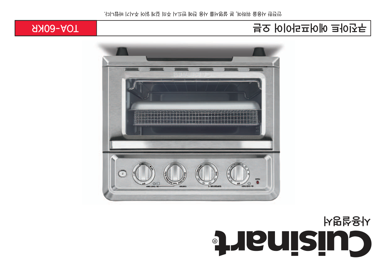 에어프라잉 팁 에어프라이로 건강한 튀김요리를 즐기실 수 있습니다. 기름에 직접 튀기지 않고도 에어프라이 를 이용하여 많은 튀김요리를 하실 수 있으며, 기름에 직접 튀긴 요리보다 덜 느끼하고 담백한 맛을 느낄 수 있습니다. 에어프라잉 시 대부분의 오일이 사용 가능하며 올리브유는 더욱 깊은 풍미를 제공합니다. 식용유와 카놀라유 혹은 포도씨유는 부드러운 맛을 내고자 할 때 권장합니다. 조리 시 골고루 기름을 둘러 바삭하고 노릇하게 잘 구워진 최상의 요리를 완성하세요. 오일을 뿌리거나 브러시로 발라서 에어프라이 기능으로 조리하세요. 혹은 올리브 오일과 논스틱 조리 용 스프레이(Non stick cooking spray) 등을 사용하실 수 있습니다. 에어프라이용 음식에는 빵 가루, 양념된 빵 가루, 판코(Panko) 빵 가루, 콘플래이크, 감자 칩 가루, 통밀크래커 가루, 퀴노아, 다양한 밀가루 등 여러가지 혼합물의 다양한 종류의 코팅을 사용 할 수 있습니다. 대부분의 음식은 조리 중 뒤집을 필요가 없지만, 닭고기 커틀렛과 같은 부피가 큰 음식들이나 에어프라이 기능으로 많은 양의 음식을 조리 시에는, 조리 중간에 한 번 뒤집어주어 빠르고 골고루 노릇하게 조리하세요. 베이컨이나 칩과 같이 빠른 조리가 필요할 시에는 높은 온도를 사용하고, 오랜 조리 시간이 필요한 튀김옷을 입힌 닭 요리는 낮은 온도를 사용해 주세요. 음식을 동일한 크기로 잘라 사용하시면 보다 골고루 조리됩니다. 베이킹 트레이에 알루미늄 호일을 깔아 사용하시면 쉽게 청소가 가능합니다. 많은 양의 요리를 장시간 할 때는 수분이 발생하여 결로가 생길 수 있으므로 이점 유의해 주시기 바랍니다. 세척 및 관리 반드시 전기 콘센트에서 오븐의 전기코드를 빼고 오븐을 완전히 식힌 후 청소하여 주세요. 깨끗한 젖은 천으로 외부를 닦고 완전히 건조합니다. 세제를 직접 제품에 묻히지 말고 천에 묻혀 청소하세요. 연마제를 사용할 경우 마감재가 훼손될 수 있습니다. 젖은 천과 순한 액상세제를 사용하거나 스펀지에 스프레이 용액을 묻혀 내부 벽을 청소하세요. 오븐 표면 및 내부에 거친 연마제나 부식성 제품 그리고 금속성 수세미를 절대로 사용해서는 안됩니다. 제품 손상의 원인이 됩니다. 오븐랙, 베이킹 팬, 에어프라이어 바스켓, 빵 부스러기 받침대는 거품 온수 에서 손으로 씻거나 나일론 수세미 혹은 나일론 솔을 사용하세요.식기 세척기 사용은 금해주세요. 기름진 음식을 조리한 후 오븐이 식은 후에 오븐 내부의 상부를 반드시 청소하세요. 이를 정기적 으로 하시면 오븐을 항상 새 것 처럼 사용하실 수 있고, 매 사용시마다 일관된 조리결과를 얻으실 수 있습니다. 빵 부스러기 받침대를 꺼내 빵 부스러기를 버린 후 깨끗하게 닦아 다시 넣어주세요. 구이 후 잔여 기름기를 제거하려면, 거품 온수 혹은 비연마성 세제를 사용하세요. 빵 부스러기 받침대를 넣지 않은 상태에서 오븐을 절대 작동하지 마세요. 오븐 주변에 절대 전기코드를 감지 마시고, 오븐 뒷 편의 전기코드 보관걸이에 감아주세요. 기타 모든 서비스는 공인된 쿠진아트 서비스센터를 통해 받으셔야 합니다.