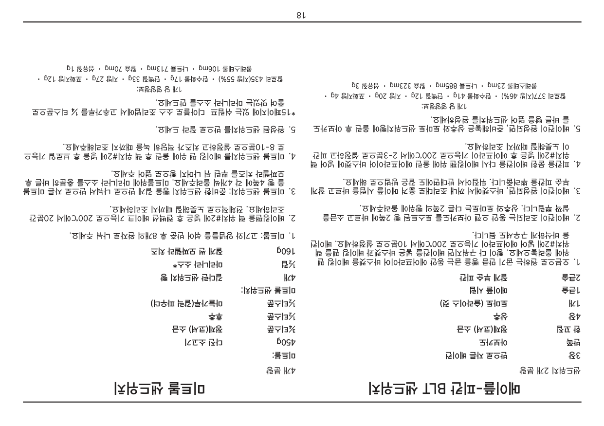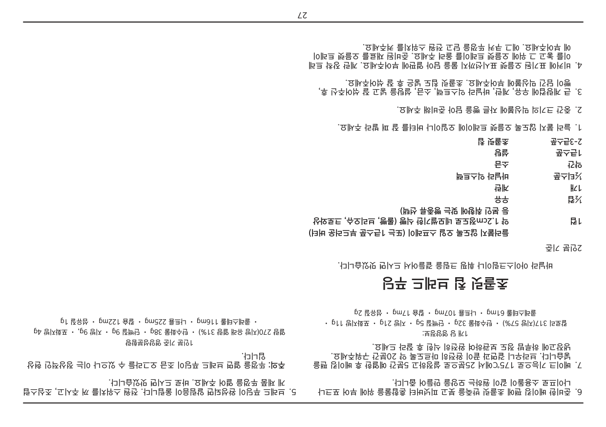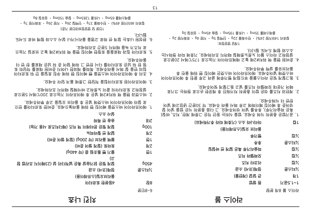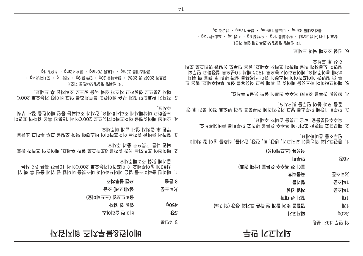 • 만약 플러그가 콘센트와 맞지 않을 경우 강제로 연결하지 않도록 합니다. • 본 사용설명서의 안전사항을 반드시 지켜주시기 바랍니다. 본 제품은 가정용으로 제작 되었으며, 상업 용도 및 그 외의 목적으로 사용 시 품질보증기간이 단축될 수 있습니다.2 목 차 안전주의사항. . . . . . . . . . . . . . . . . . . . . . . . . . . . . . . . . . . . . . . . . . . . . . . . . . .2 코드 사용 시 주의사항 . . . . . . . . . . . . . . . . . . . . . . . . . . . . . . . . . . . . . . . . . . . .3 기능 및 구성품 . . . . . . . . . . . . . . . . . . . . . . . . . . . . . . . . . . . . . . . . . . . . . . . . .4 처음 사용하기 전. . . . . . . . . . . . . . . . . . . . . . . . . . . . . . . . . . . . . . . . . . . . . . . .5 주의사항 및 안내. . . . . . . . . . . . . . . . . . . . . . . . . . . . . . . . . . . . . . . . . . . . . . . .5 오븐랙/팬 위치안내. . . . . . . . . . . . . . . . . . . . . . . . . . . . . . . . . . . . . . . . . . . . . .5 제품 사용법. . . . . . . . . . . . . . . . . . . . . . . . . . . . . . . . . . . . . . . . . . . . . . . . . . . .6 세척 및 관리. . . . . . . . . . . . . . . . . . . . . . . . . . . . . . . . . . . . . . . . . . . . . . . . . . .7 레시피 . . . . . . . . . . . . . . . . . . . . . . . . . . . . . . . . . . . . . . . . . . . . . . . . . . . . . . .9 품질보증서 . . . . . . . . . . . . . . . . . . . . . . . . . . . . . . . . . . . . . . . . . . . . . . . . . . .34 안전주의사항 아래의 안전주의사항은 제품을 안전하고 올바르게 사용하여, 예기치 못한 위험이나 손해를 사전에 방지하기 위한 것입니다. 기본적인 주의사항은 다음과 같습니다.