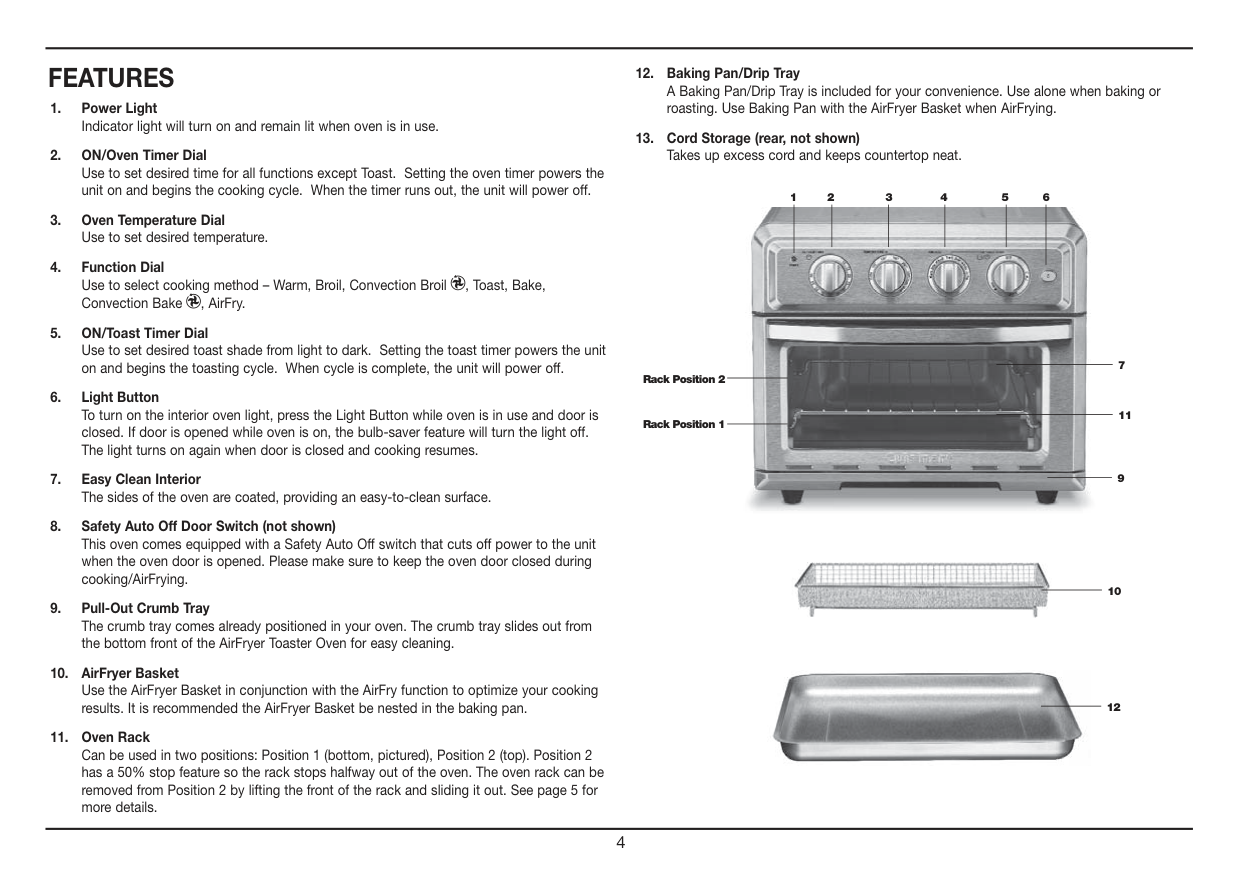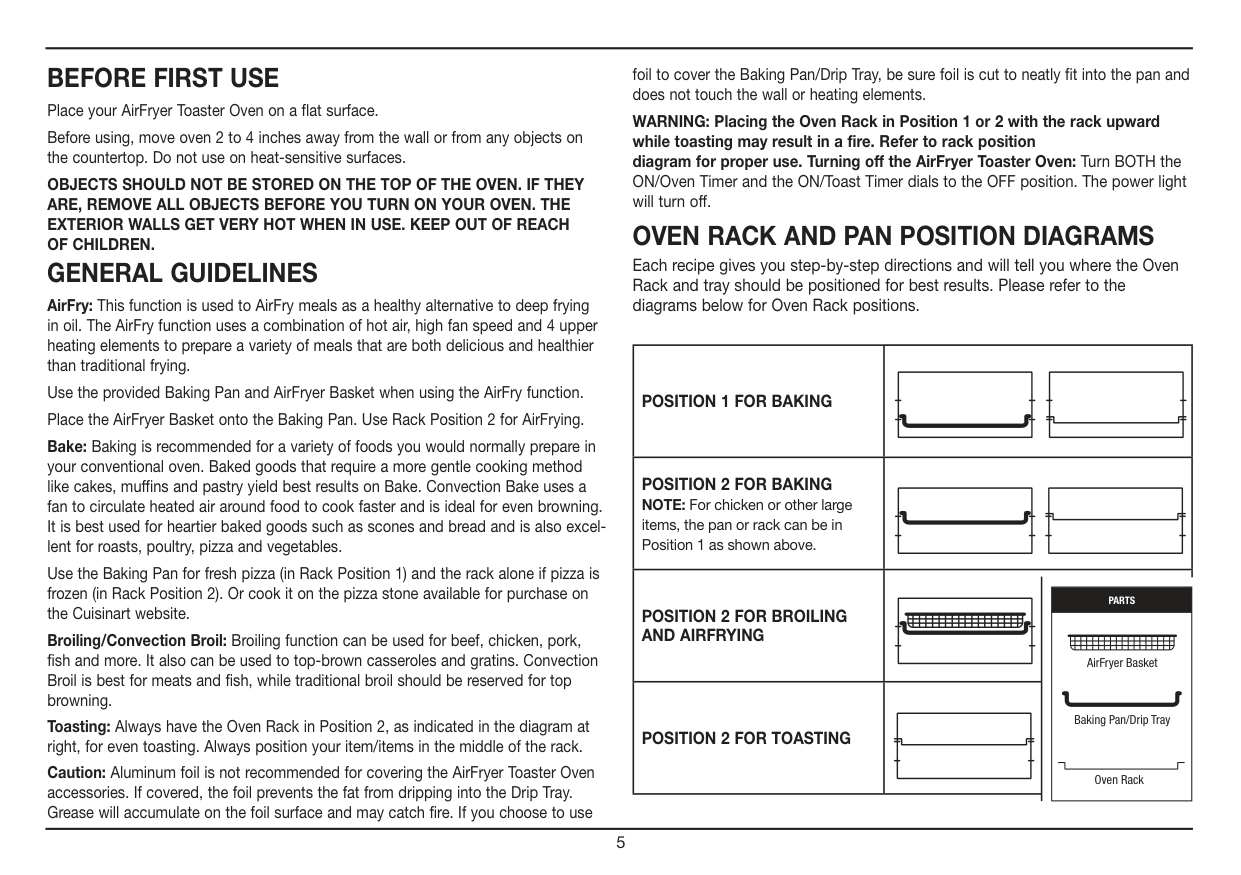 AirFry: This function is used to AirFry meals as a healthy alternative to deep frying in oil. The AirFry function uses a combination of hot air, high fan speed and 4 upper heating elements to prepare a variety of meals that are both delicious and healthier than traditional frying. Use the provided Baking Pan and AirFryer Basket when using the AirFry function. Place the AirFryer Basket onto the Baking Pan. Use Rack Position 2 for AirFrying. Bake: Baking is recommended for a variety of foods you would normally prepare in your conventional oven. Baked goods that require a more gentle cooking method like cakes, muffins and pastry yield best results on Bake. Convection Bake uses a fan to circulate heated air around food to cook faster and is ideal for even browning. It is best used for heartier baked goods such as scones and bread and is also excel- lent for roasts, poultry, pizza and vegetables. Use the Baking Pan for fresh pizza (in Rack Position 1) and the rack alone if pizza is frozen (in Rack Position 2). Or cook it on the pizza stone available for purchase on the Cuisinart website. Broiling/Convection Broil: Broiling function can be used for beef, chicken, pork, fish and more. It also can be used to top-brown casseroles and gratins. Convection Broil is best for meats and fish, while traditional broil should be reserved for top browning. Toasting: Always have the Oven Rack in Position 2, as indicated in the diagram at right, for even toasting. Always position your item/items in the middle of the rack. Caution: Aluminum foil is not recommended for covering the AirFryer Toaster Oven accessories. If covered, the foil prevents the fat from dripping into the Drip Tray. Grease will accumulate on the foil surface and may catch fire. If you choose to use foil to cover the Baking Pan/Drip Tray, be sure foil is cut to neatly fit into the pan and does not touch the wall or heating elements. WARNING: Placing the Oven Rack in Position 1 or 2 with the rack upward while toasting may result in a fire. Refer to rack position diagram for proper use. Turning off the AirFryer Toaster Oven: Turn BOTH the ON/Oven Timer and the ON/Toast Timer dials to the OFF position. The power light will turn off.Oven Rack And Pan Position Diagrams