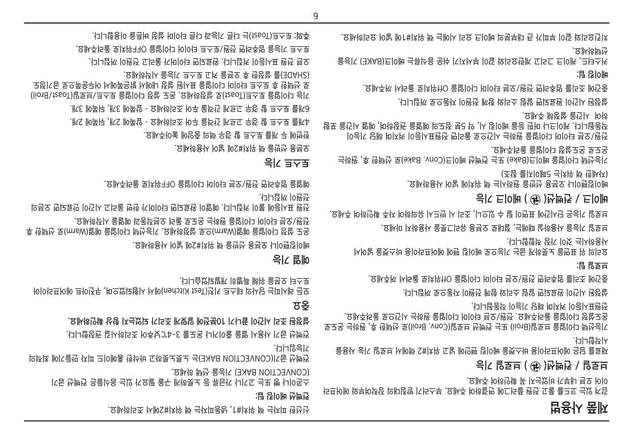 8 식품 적정 조리량 조리 온도 조리 시간 베이컨 8장 200℃ 8-10분 치킨 윙 약 20개 (약 1.3kg) 200℃ 20-25분 냉동 간식(모짜렐라 치즈스틱, 팝콘새우, 등) 약 28개 치즈스틱 (약 680g) 200℃ 5-7 분 냉동 치킨 너겟 약 34개 치킨 너겟 (약 450g) 200℃ 10 분 냉동 생선 조각 약 20개 생선조각 (약 340g) 200℃ 8 분 냉동 감자튀김 약 450~900g 230℃ 15-25 분 냉동 웨지감자 약 450~900g 230℃ 15-25 분 핸드컷 감자튀김 약 900g(중간 크기 감자 3개정도 – 길이 10cm두께 6mm정도) 200℃ 15-20 분 핸드컷 웨지감자 약 900g(큰 사이즈 감자 3개 정도 – 8cm길이) 200℃ 15-20 분 새우 약 450g(약 16개 큰 새우) 190℃ 8-10 분 토르티야 칩 6장의 15cm길이의 토르티야 1/4컷 200℃ 5-6 분, (조리 중 한번 뒤집어주세요) 에어프라이어 조리 안내표 아래의 표에서 쿠진아트 에어프라이어 토스트 오븐(Cuisinart! AirFryer Toaster Oven )을 사용해 에어프라이를 할 수 있는 다양한 종류의 음식에 대한 권장 조리시간과 온도 및 양을 확인하실 수 있습니다. 만약 권장된 양을 초과하여 조리할 경우 조리 중 뒤집어주어 고르게 조리할 수 있습니다. 적은양의 조리 시에는 조리시간이 단축됩니다. 최상의 에어프라이 조리를 하고자 하실 경우 오븐 조명을 사용하여 조리과정을 확인 하시기 바랍니다. 에어프라이 기능은 오일 없이 가능하지만, 음식 표면에 오일을 살짝 바르거나 뿌려주면 보다 노릇하고 바삭한 식감을 얻으실 수 있습니다.