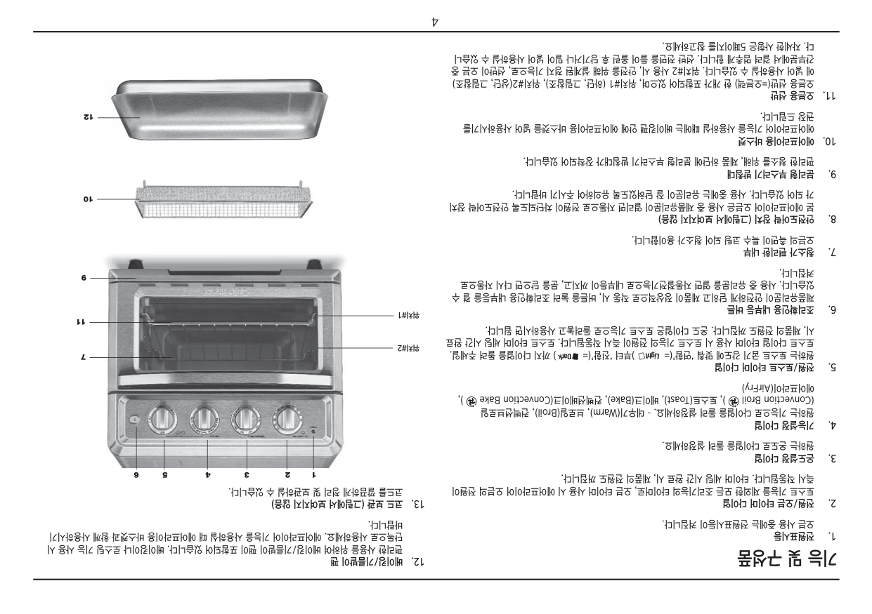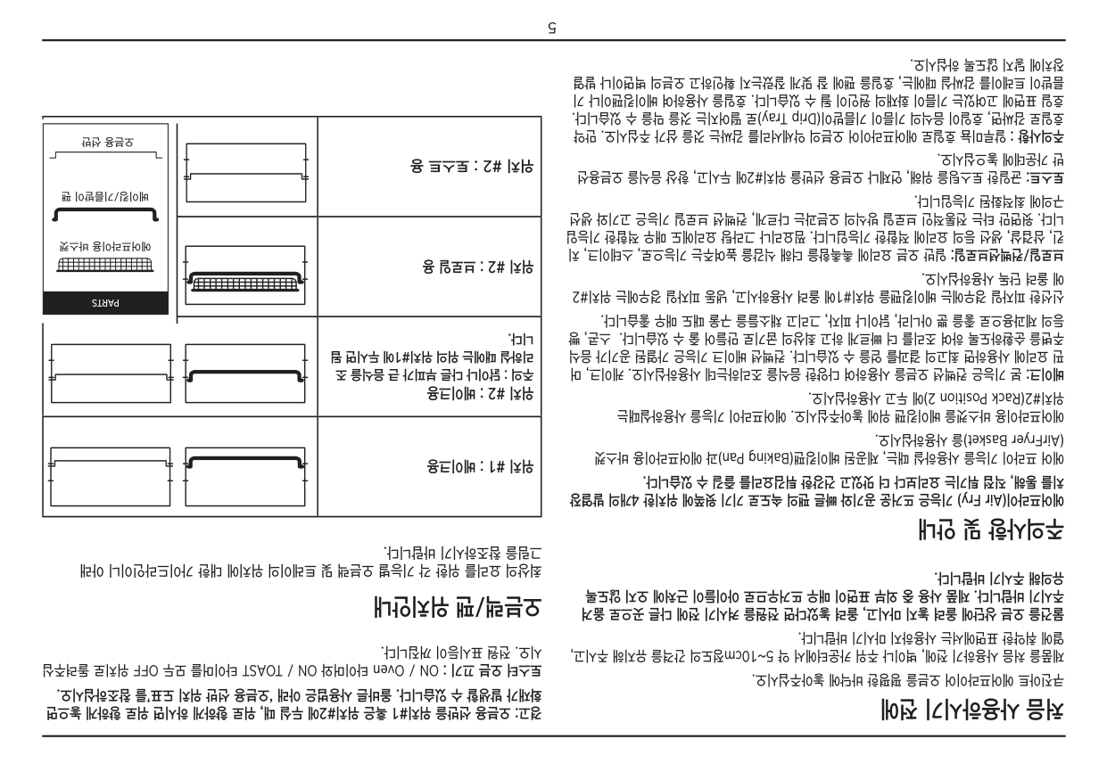 위치#2(Rack Position 2)에 두고 사용하십시오. 베이크: 본 기능은 컨벡션 오븐을 사용하여 다양한 음식을 조리하는데 사용하십시오. 케이크, 머 핀 요리에 사용하면 최고의 결과를 얻을 수 있습니다. 컨벡션 베이크 기능은 가열된 공기가 음식 주변을 순환하도록 하여 조리를 더 빠르게 하고 최상의 굽기로 만들어 줄 수 있습니다. 스콘, 빵 등의 제과용으로 좋을 뿐 아니라, 닭이나 피자, 그리고 채소들을 구울 때도 매우 좋습니다. 신선한 피자일 경우에는 베이킹팬을 위치#1에 올려 사용하시고, 냉동 피자일 경우에는 위치#2 에 올려 단독 사용하십시오. 브로일/컨벡션브로일: 일반 오븐 요리에 촉촉함을 더해 식감을 높여주는 기능으로, 스테이크, 치 킨, 삼겹살, 생선 등의 요리에 적합한 기능입니다. 찜요리나 그라탕 요리에도 매우 적합한 기능입 니다. 윗면만 타는 전통적인 브로일 방식의 오븐과는 다르게, 컨벡션 브로일 기능은 고기와 생선 구의에 최적화된 기능입니다. 토스트: 균일한 토스팅을 위해, 언제나 오븐용 선반을 위치#2에 두시고, 항상 음식을 오븐용선 반 가운데에 놓으십시오. 주의사항 : 알루미늄 호일로 에어프라이어 오븐의 악세서리를 감싸는 것을 삼가 주십시오. 만약 호일로 감싸면, 호일이 음식의 기름이 기름받이(Drip Tray)로 떨어지는 것을 막을 수 있습니다. 호일 표면에 고여있는 기름이 화재의 원인이 될 수 있습니다. 호일을 사용하여 베이킹팬이나 기 름받이 트레이를 감싸실 때에는, 호일을 팬에 잘 맞게 잘랐는지 확인하고 오븐의 벽면이나 발열 장치에 닿지 않도록 하십시오. 경고: 오븐용 선반을 위치#1 혹은 위치#2에 두실 때, 위로 향하게 하시면 위로 향하게 놓으면 화재가 발생할 수 있습니다. 올바른 사용법은 아래 ‘오븐용 선반 위치 도표’를 참조하십시오. 토스터 오븐 끄기 : ON / Oven 타이머와 ON / TOAST 타이머를 모두 OFF 위치로 돌려주십 시오. 전원 표시등이 꺼집니다. 오븐랙/팬 위치안내 최상의 요리를 위한 각 기능별 오븐랙 및 트레이의 위치에 대한 가이드라인이니 아래 그림을 참조하시기 바랍니다. 위치 #1 : 베이크용 위치 #2 : 베이크용 주의 : 닭이나 다른 부피가 큰 음식을 조 리하실 때에는 위의 위치#1에 두시면 됩 니다. 위치 #2 : 브로일 용 위치 #2 : 토스트 용 오븐용 선반 베이킹/기름받이 팬 에어프라이용 바스켓