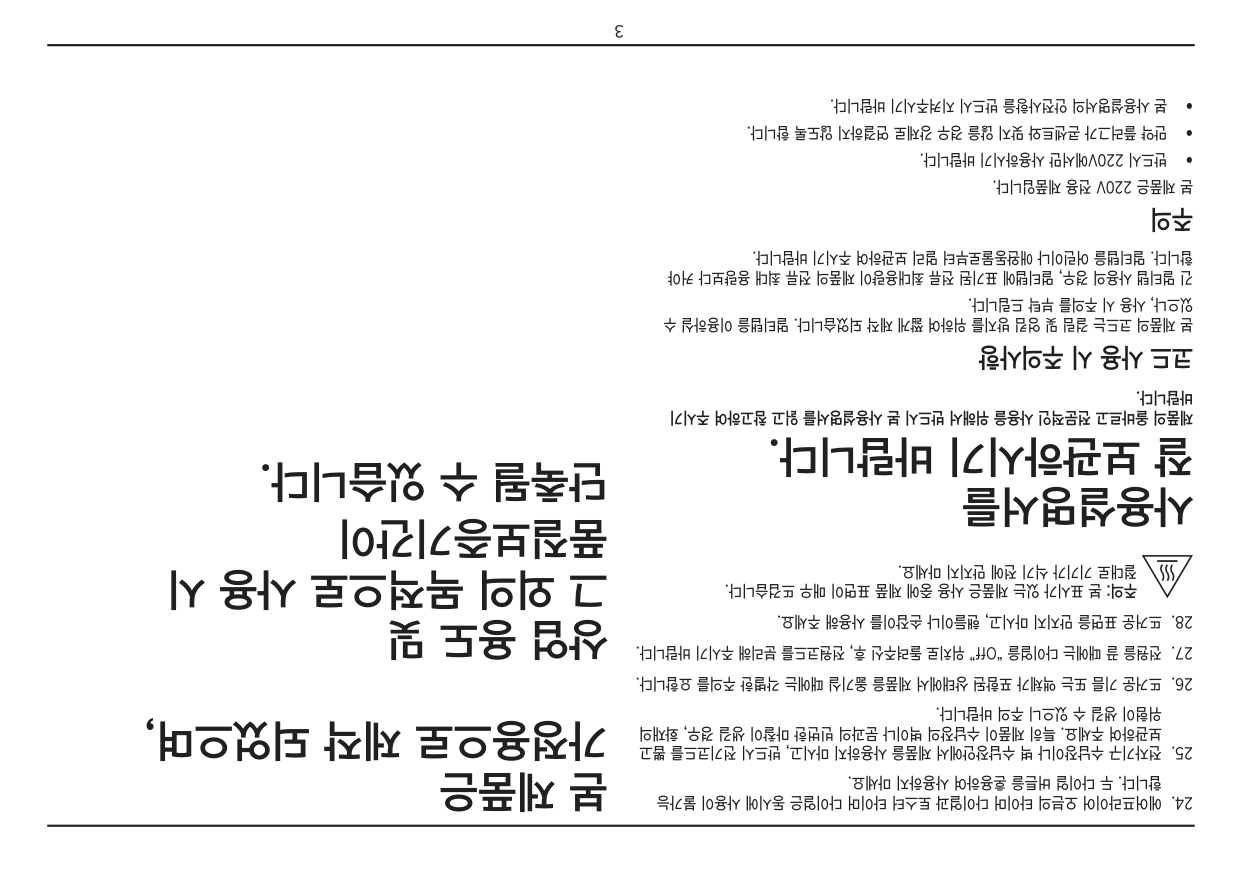 절대로 기기가 식기 전에 만지지 마세요. 사용설명서를 잘 보관하시기 바랍니다. 제품의 올바르고 전문적인 사용을 위해서 반드시 본 사용설명서를 읽고 참고하여 주시기 바랍니다. 코드 사용 시 주의사항 본 제품의 코드는 걸림 및 엉킴 방지를 위하여 짧게 제작 되었습니다. 멀티탭을 이용하실 수 있으나, 사용 시 주의를 부탁 드립니다. 긴 멀티탭 사용의 경우, 멀티탭에 표기된 전류 최대용량이 제품의 전류 최대 용량보다 커야 합니다. 멀티탭을 어린이나 애완동물로부터 멀리 보관하여 주시기 바랍니다. 주의