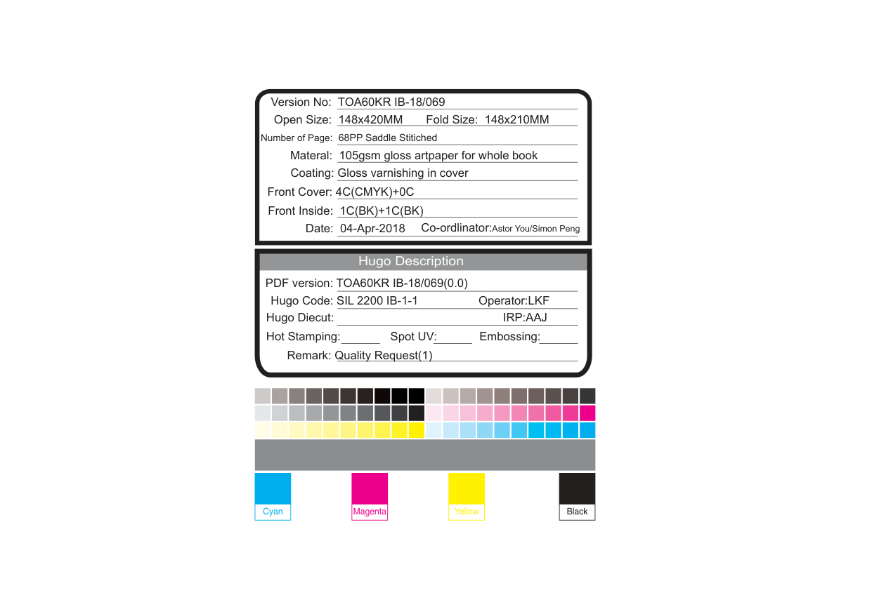 Version No: TOA60KR IB-18/069 Open Size: 148x420MM Fold Size: 148x210MM Number of Page: Materal: 105gsm gloss artpaper for whole book Coating: Gloss varnishing in cover Front Cover: 4C(CMYK)+0C PDF version: TOA60KR IB-18/069(0.0) Hugo Code: SIL 2200 IB-1-1 Operator:LKF Hugo Diecut: