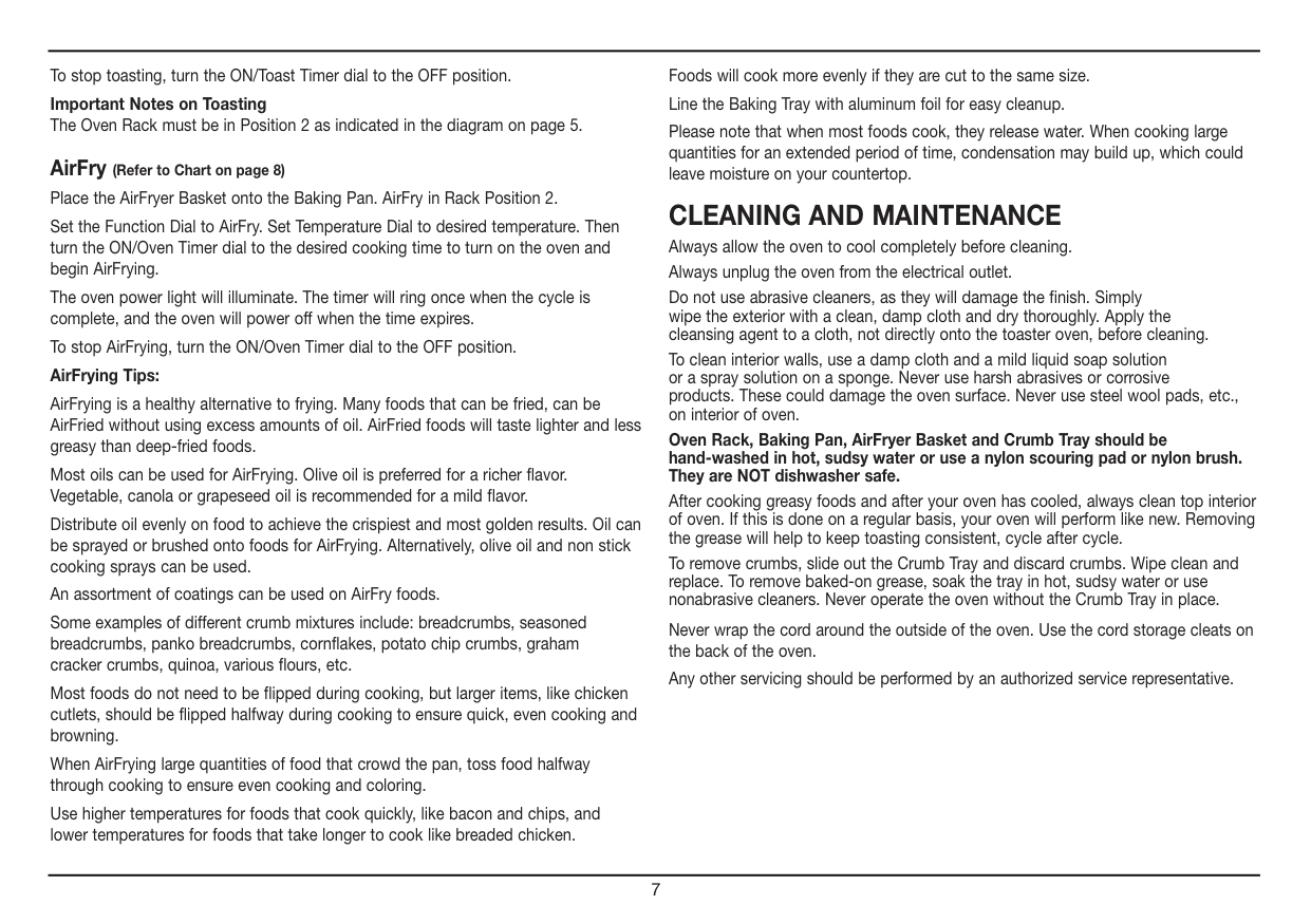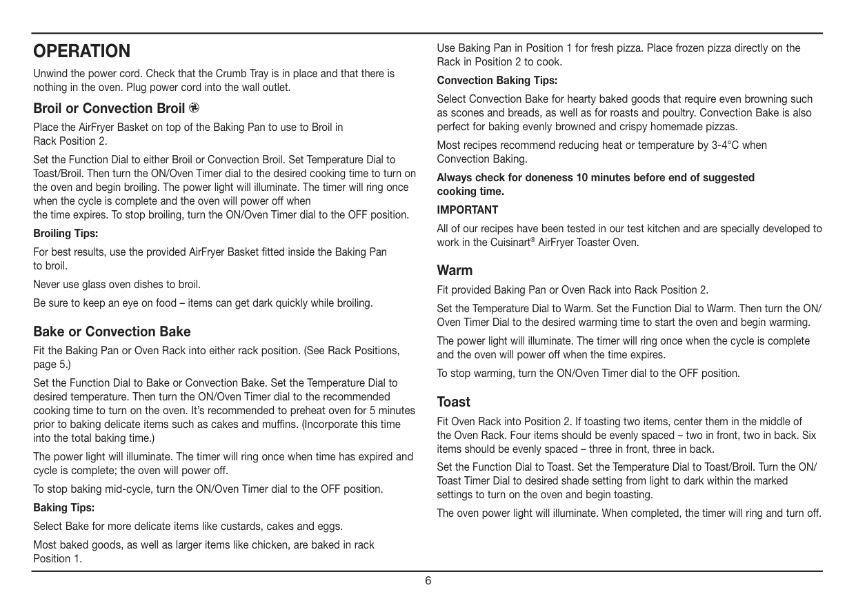 Unwind the power cord. Check that the Crumb Tray is in place and that there is nothing in the oven. Plug power cord into the wall outlet. Broil or Convection Broil Place the AirFryer Basket on top of the Baking Pan to use to Broil in Rack Position 2. Set the Function Dial to either Broil or Convection Broil. Set Temperature Dial to Toast/Broil. Then turn the ON/Oven Timer dial to the desired cooking time to turn on the oven and begin broiling. The power light will illuminate. The timer will ring once when the cycle is complete and the oven will power off when the time expires. To stop broiling, turn the ON/Oven Timer dial to the OFF position. Broiling Tips: For best results, use the provided AirFryer Basket fitted inside the Baking Pan to broil. Never use glass oven dishes to broil. Be sure to keep an eye on food – items can get dark quickly while broiling. Bake or Convection Bake Fit the Baking Pan or Oven Rack into either rack position. (See Rack Positions, page 5.) Set the Function Dial to Bake or Convection Bake. Set the Temperature Dial to desired temperature. Then turn the ON/Oven Timer dial to the recommended cooking time to turn on the oven. It’s recommended to preheat oven for 5 minutes prior to baking delicate items such as cakes and muffins. (Incorporate this time into the total baking time.) The power light will illuminate. The timer will ring once when time has expired and cycle is complete; the oven will power off. To stop baking mid-cycle, turn the ON/Oven Timer dial to the OFF position. Baking Tips: Select Bake for more delicate items like custards, cakes and eggs. Most baked goods, as well as larger items like chicken, are baked in rack Position 1. Use Baking Pan in Position 1 for fresh pizza. Place frozen pizza directly on the Rack in Position 2 to cook. Convection Baking Tips: Select Convection Bake for hearty baked goods that require even browning such as scones and breads, as well as for roasts and poultry. Convection Bake is also perfect for baking evenly browned and crispy homemade pizzas. Most recipes recommend reducing heat or temperature by 3-4°C when Convection Baking. Always check for doneness 10 minutes before end of suggested cooking time.Important
