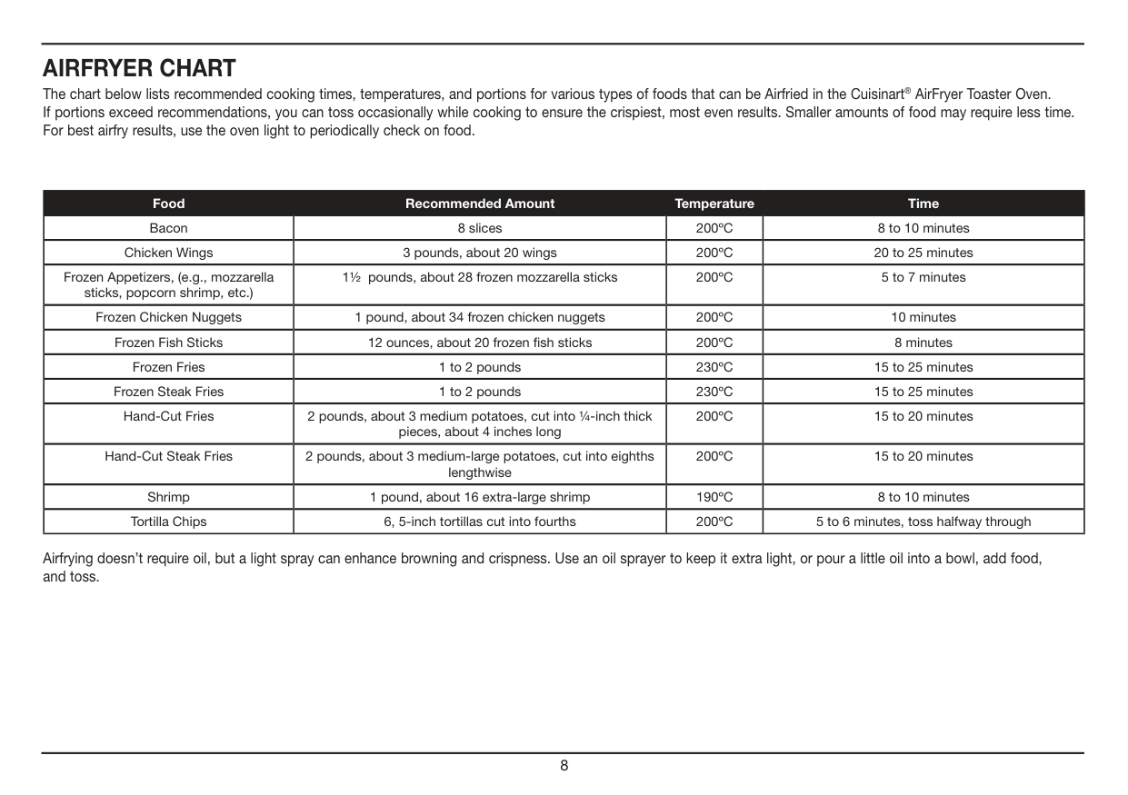 The chart below lists recommended cooking times, temperatures, and portions for various types of foods that can be Airfried in the Cuisinart® AirFryer Toaster Oven. If portions exceed recommendations, you can toss occasionally while cooking to ensure the crispiest, most even results. Smaller amounts of food may require less time. For best airfry results, use the oven light to periodically check on food. Airfrying doesn’t require oil, but a light spray can enhance browning and crispness. Use an oil sprayer to keep it extra light, or pour a little oil into a bowl, add food, and toss.9