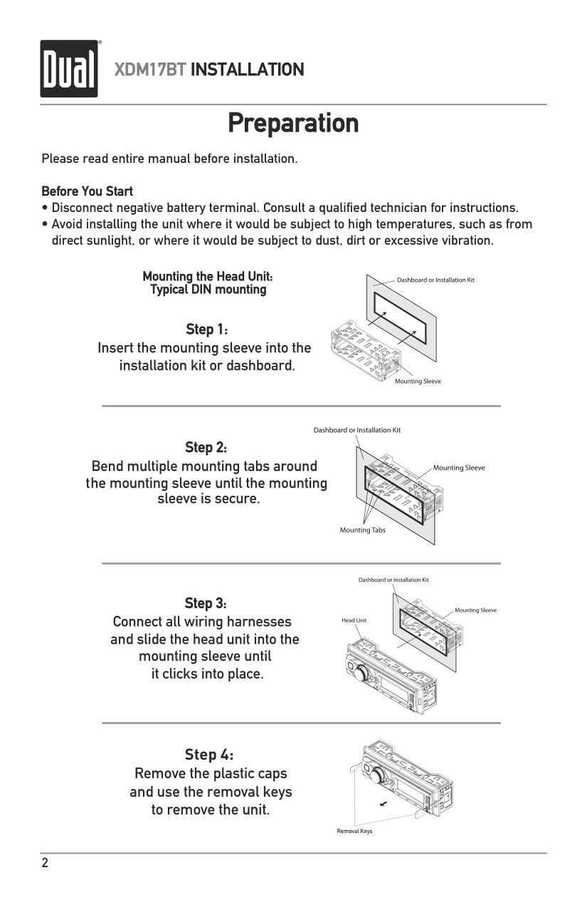 Limited One Year Warranty This warranty gives you specific legal rights. You may also have other rights which vary from state to state. Dual Electronics Corp. warrants this product to the original purchaser to be free from defects in material and workmanship for a period of one year from the date of the original purchase. Dual Electronics Corp. agrees, at our option, during the warranty period, to repair any defect in material or workmanship or to furnish an equal new, renewed or comparable product (whichever is deemed necessary) in exchange without charges, subject to verification of the defect or malfunction and proof of the date of purchase. Subsequent replacement products are warranted for the balance of the original warranty period. Who is covered? This warranty is extended to the original retail purchaser for products purchased from an authorized Dual dealer and used in the U.S.A. What is covered? This warranty covers all defects in material and workmanship in this product. The following are not covered: software, installation/removal costs, damage resulting from accident, misuse, abuse, neglect, product modification, improper installation, incorrect line voltage, unauthorized repair or failure to follow instructions supplied with the product, or damage occurring during return shipment of the product. Specific license conditions and copyright notices for the software can be found via www.dualav.com. What to do?13