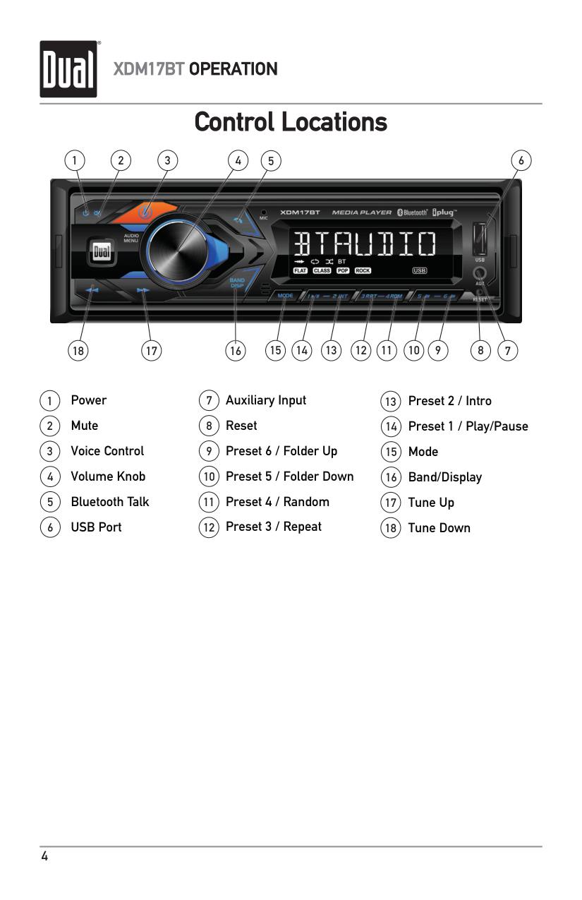 Control Locations Preset 2 / Intro Preset 1 / Play/Pause Mode Band/Display Tune Up Tune Down Power Mute Voice Control Volume Knob Bluetooth Talk USB Port 1 2 3 4 5 1 11 2 12 3 13 4 14 5 15 6 16 7 17 8 18 9 10 7 6 15 14 13 12 11 10 9 17 18 16 Auxiliary Input Reset Preset 6 / Folder Up Preset 5 / Folder Down Preset 4 / Random Preset 3 / Repeat 85