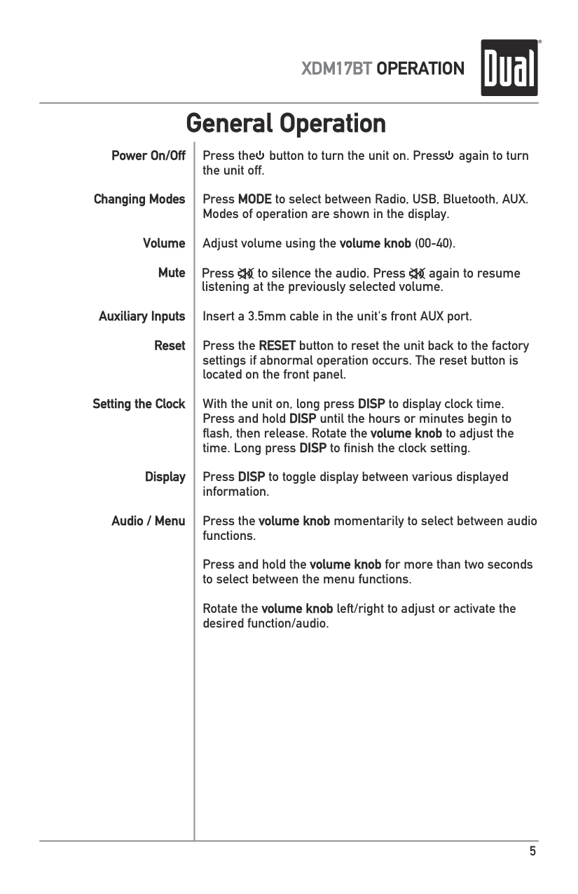 General Operation Press the button to turn the unit on. Press again to turn the unit off. Press MODE to select between Radio, USB, Bluetooth, AUX. Modes of operation are shown in the display. Adjust volume using the volume knob (00-40). Insert a 3.5mm cable in the unit's front AUX port. Press the RESET button to reset the unit back to the factory settings if abnormal operation occurs. The reset button is located on the front panel. With the unit on, long press DISP to display clock time. Press and hold DISP until the hours or minutes begin to flash, then release. Rotate the volume knob to adjust the time. Long press DISP to finish the clock setting. Press DISP to toggle display between various displayed information. Press the volume knob momentarily to select between audio functions. Press and hold the volume knob for more than two seconds to select between the menu functions. Rotate the volume knob left/right to adjust or activate the desired function/audio. Power On/Off Changing Modes Volume Mute Auxiliary Inputs Reset Setting the Clock Display Audio / Menu6