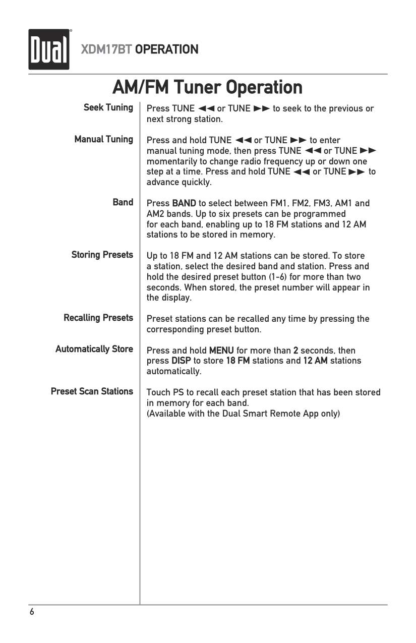 AM/FM Tuner Operation Seek Tuning Manual Tuning Band Storing Presets Recalling Presets Automatically Store Preset Scan Stations Press TUNE or TUNE to seek to the previous or next strong station. Press and hold TUNE or TUNE to enter manual tuning mode, then press TUNE or TUNE momentarily to change radio frequency up or down one step at a time. Press and hold TUNE or TUNE to advance quickly. Press BAND to select between FM1, FM2, FM3, AM1 and AM2 bands. Up to six presets can be programmed for each band, enabling up to 18 FM stations and 12 AM stations to be stored in memory. Up to 18 FM and 12 AM stations can be stored. To store a station, select the desired band and station. Press and hold the desired preset button (1-6) for more than two seconds. When stored, the preset number will appear in the display. Preset stations can be recalled any time by pressing the corresponding preset button. Press and hold MENU for more than 2 seconds, then press DISP to store 18 FM stations and 12 AM stations automatically. Touch PS to recall each preset station that has been stored in memory for each band. (Available with the Dual Smart Remote App only)7