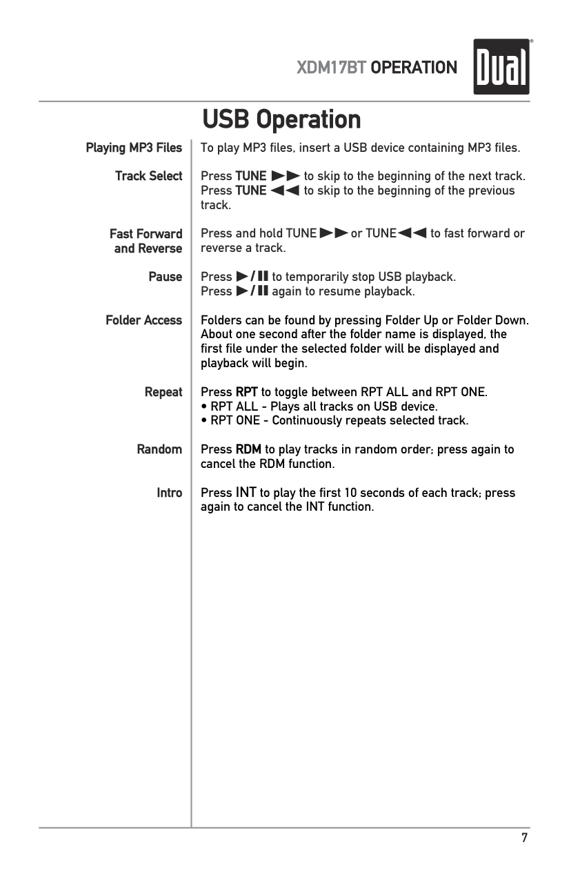 USB Operation Playing MP3 Files Track Select Fast Forward and Reverse Pause Folder Access Repeat Random Intro To play MP3 files, insert a USB device containing MP3 files. Press TUNE to skip to the beginning of the next track. Press TUNE to skip to the beginning of the previous track. Press and hold TUNE or TUNE to fast forward or reverse a track. Press / II to temporarily stop USB playback. Press / II again to resume playback. Folders can be found by pressing Folder Up or Folder Down. About one second after the folder name is displayed, the first file under the selected folder will be displayed and playback will begin. Press RPT to toggle between RPT ALL and RPT ONE.8